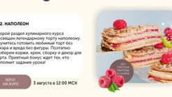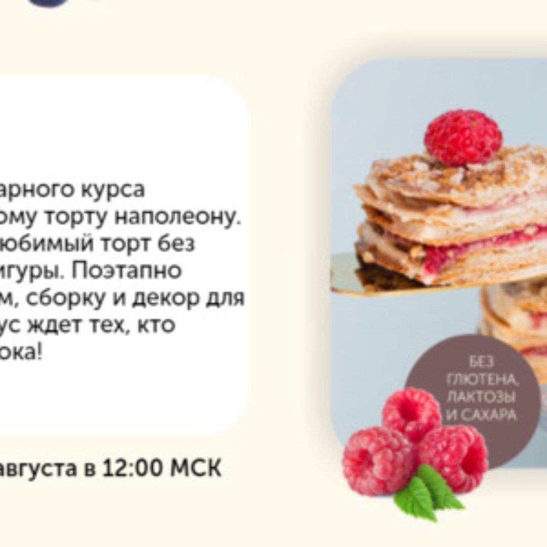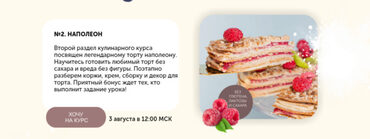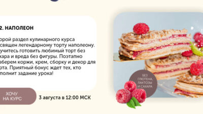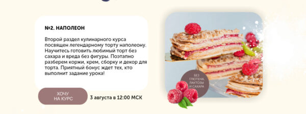 Второй раздел кулинарного курса посвящен легендарному торту наполеону. Научитесь готовить любимый торт без сахара и вреда без фигуры. Поэтапно разберем коржи, крем, сборку и декор для торта. Приятный бонус ждет тех, кто выполнит задание урока!