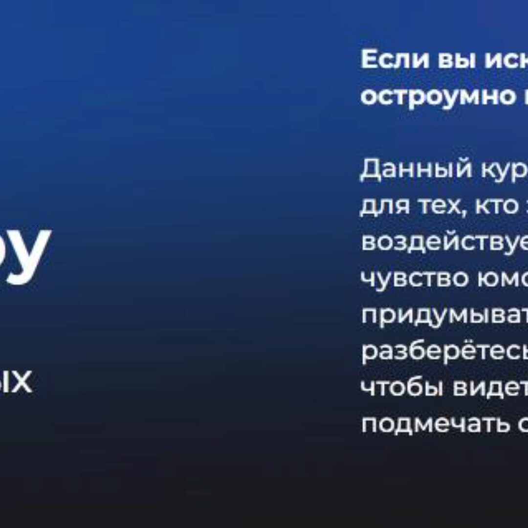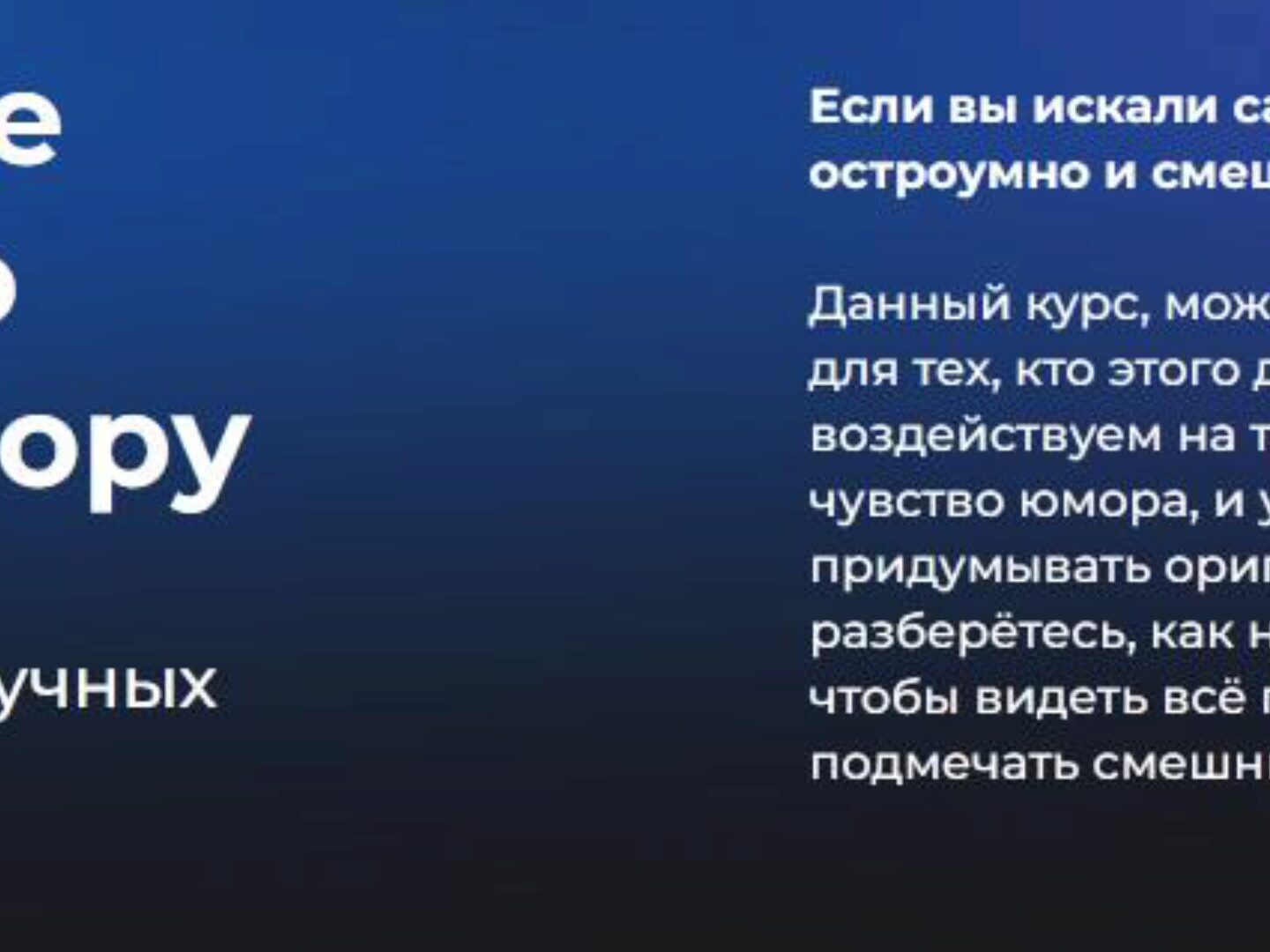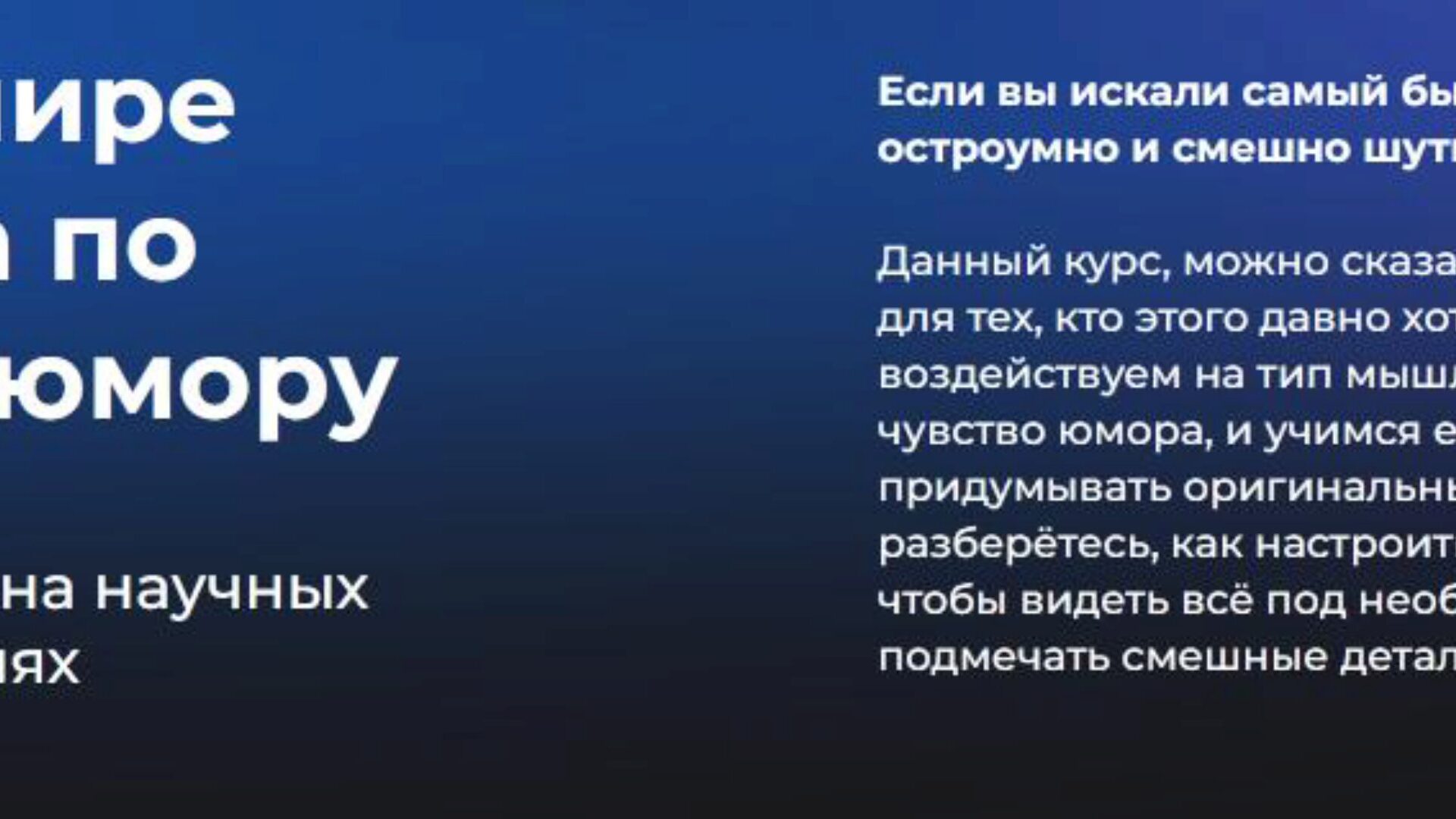 Данный курс, можно сказать, таблетка быстрого действия для тех, кто этого давно хотел. А всё потому, что в нём мы воздействуем на тип мышления, от которого зависит ваше чувство юмора, и учимся его использовать, чтобы придумывать оригинальные шутки буквально на ходу. Вы разберётесь, как настроить свой мозг таким образом, чтобы видеть всё под необычным углом, и как остроумно подмечать смешные детали, незаметные для других.