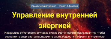 Чтобы сохранять баланс внутренней энергии и гармонию вокруг себя, стоит найти постоянные источники энергии. Есть несколько подходов к созданию больших запасов жизненной силы: накопление внутри себя или снаружи. На тренинге Вы изучите оба подхода и даже больше.