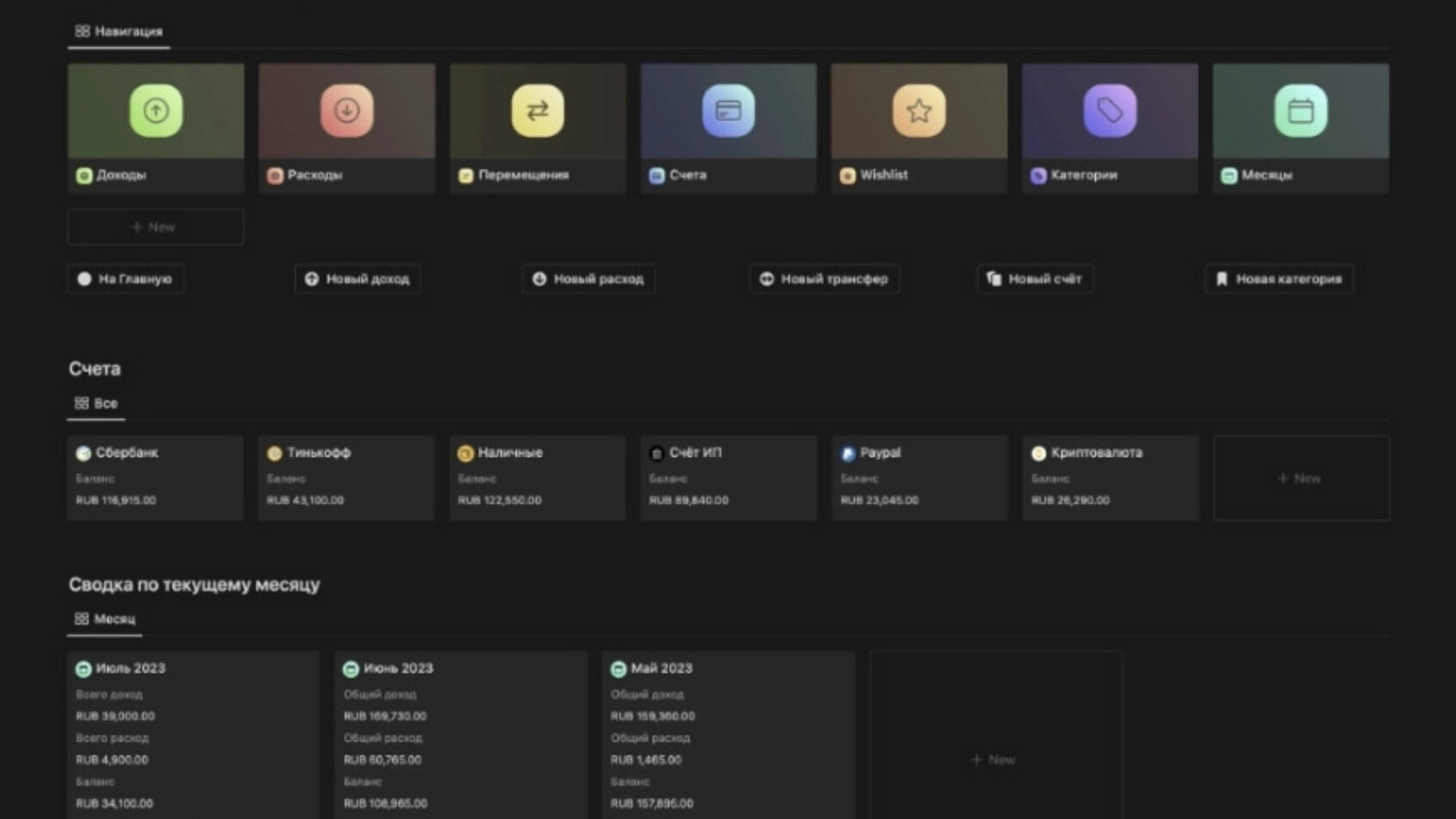 Любая новая область шаблона создаётся с помощью уже заготовленных шаблонов, вам не нужно думать как сделать новые счета, добавить расход или доход. Всё создаётся одним щелчком мыши.