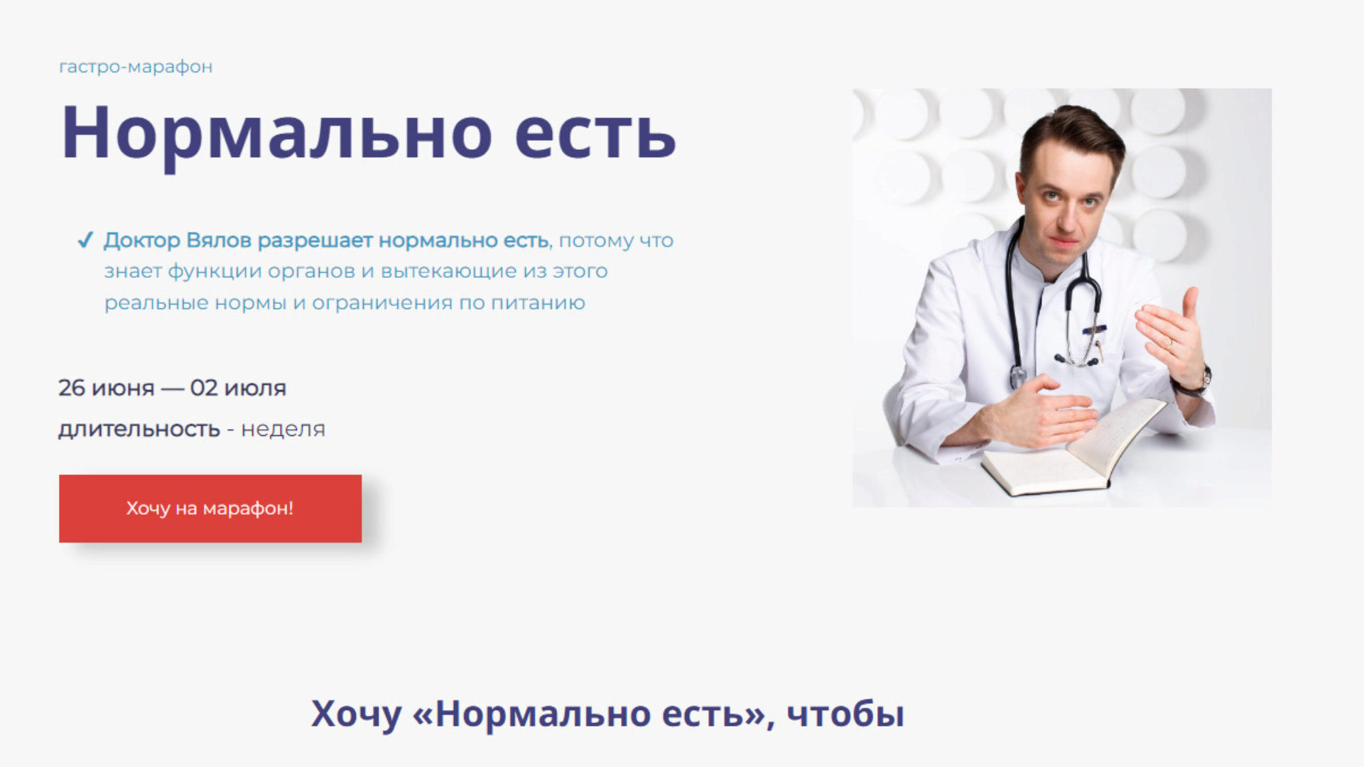 6 месяцев для полноценного питания без дефицитов Питание от гастроэнтеролога, не от диетолога или нутрициолога Насыщение питания и поиск дефицитов сразу Быстро и просто, без заморочек и подсчета калорий Кому подходит этот марафон? Хочу и люблю вкусно есть Хочу правильно питаться Есть проблемы с