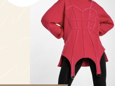 Трикотажный свитшот свободного силуэта со спущенной линией плеча. Горловина круглая, обработанная обтачкой. По переду декоративные нашивки имитирующие корсет. Рукава рубашечного покроя, низ рукава собран на сборку и обработан притачной манжетой. По линии низа свитшот обработан обтачкой. Низ переда