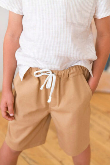 Размеры 92-122 + 128-158 Шорты умеренного объёма, прямого силуэта. Пояс находится на естественной линии талии. В притачной пояс вставлена эластичная лента. По поясу проложены две отделочные строчки. На передних половинках шорт карманы с отрезным бочком. Низ шорт фигурной формы, обработан обтачкой.