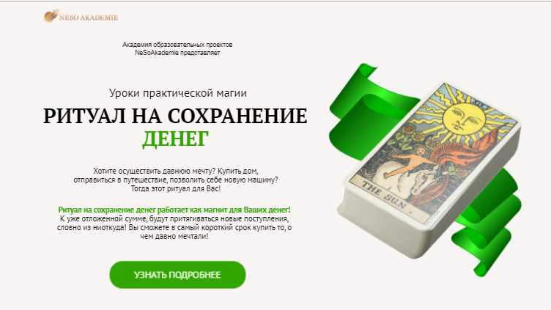 Ритуал очень хорошо сохраняет энергию денег и позволяет привлекать еще деньги откуда-то. Самый продаваемый и обсуждаемый ритуал от Софии Вюрстлин