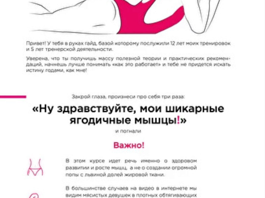 Жду тебя, если: ты недовольна формой своих ягодиц хочешь проработать конкретные зоны результат стоит на месте хочешь узнать как и за какой срок прийти к такому. Что ты узнаешь: как усилить рост ягодиц. как «не убить» колени. можно без утяжелителей? как не раскачать ноги полагаться на ощущения? а
