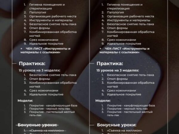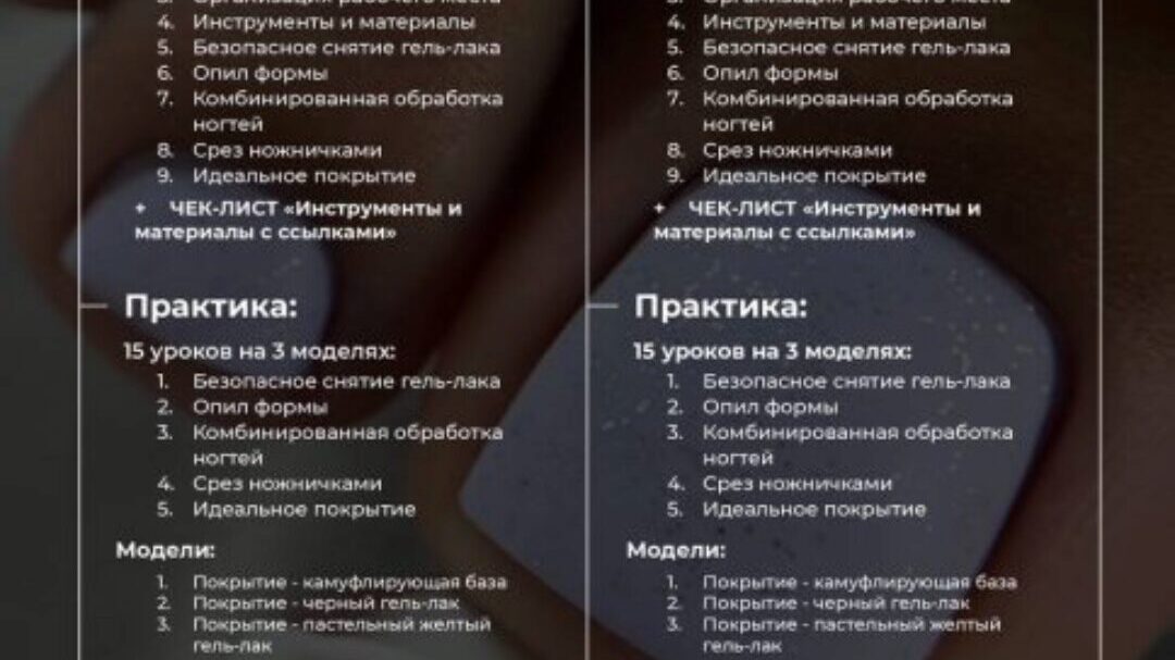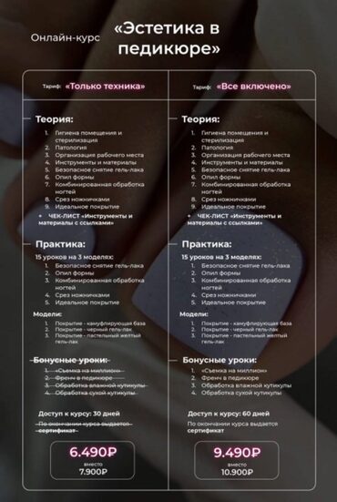 После курса вы: Освоите уникальный авторский метод безопасного эстетического педикюра; Научитесь работать как в комбинированной, так и в аппаратной технике; Разберетесь в обработке подногтевых, межпальцевых и синусовых мозолей; Узнаете самые распространенные проблемы в педикюре, сможете решать их и