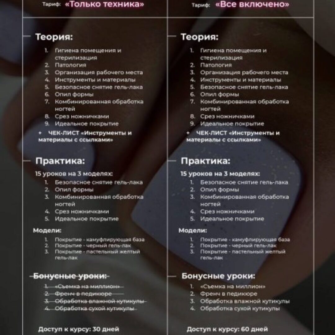 Программа курса: 1. Теоретическая часть (фото+текст): что купить, где и по каким ценам. Чем работать, опил форм и т.д. 2. Урок №1 - снятие материала (какими фрезами и почему), какие скорости, какие есть нюансы в педикюре и т.д. 3. Урок №2 - обработка пальчиков. В этом уроке вы решите проблемы с