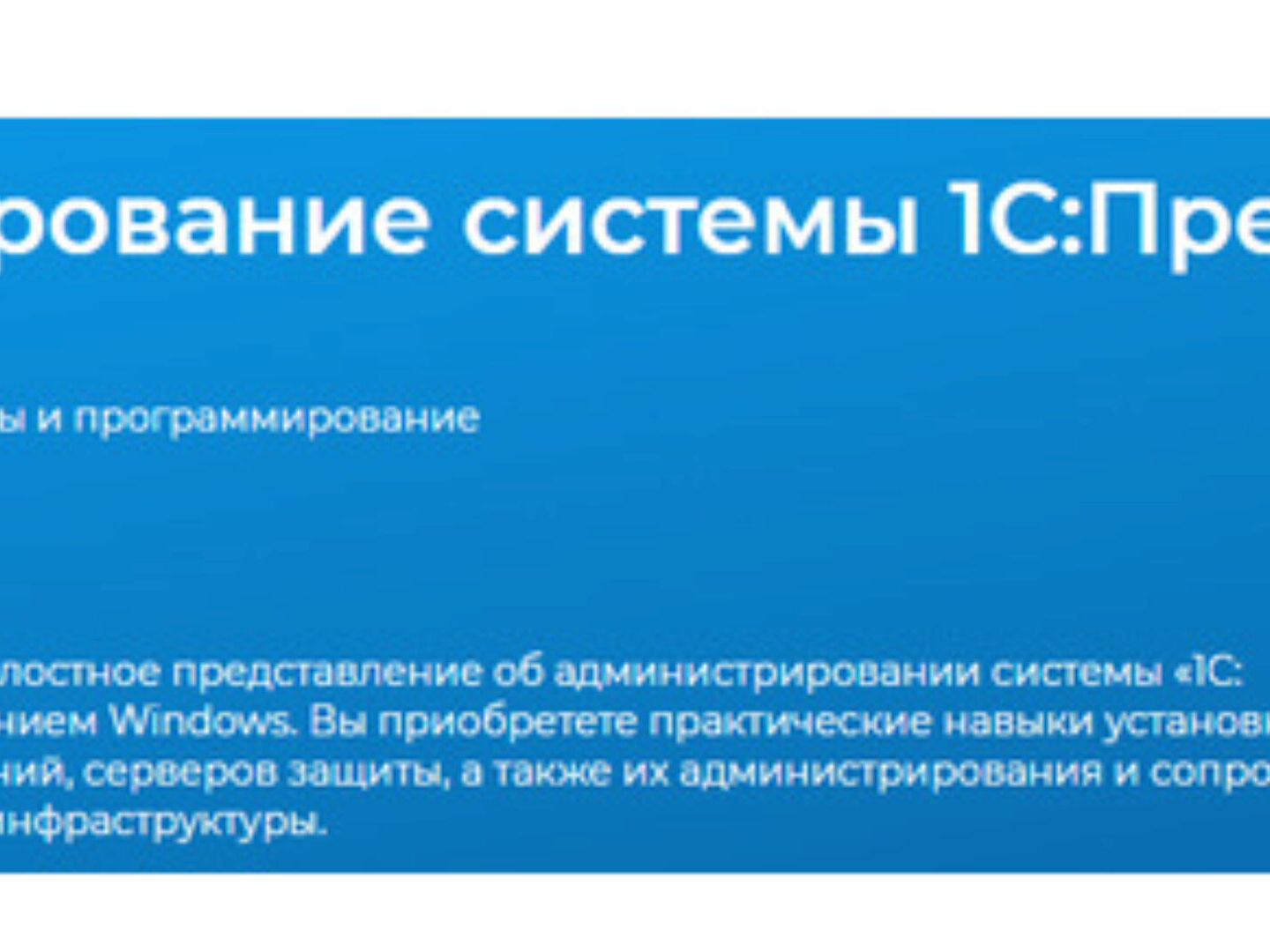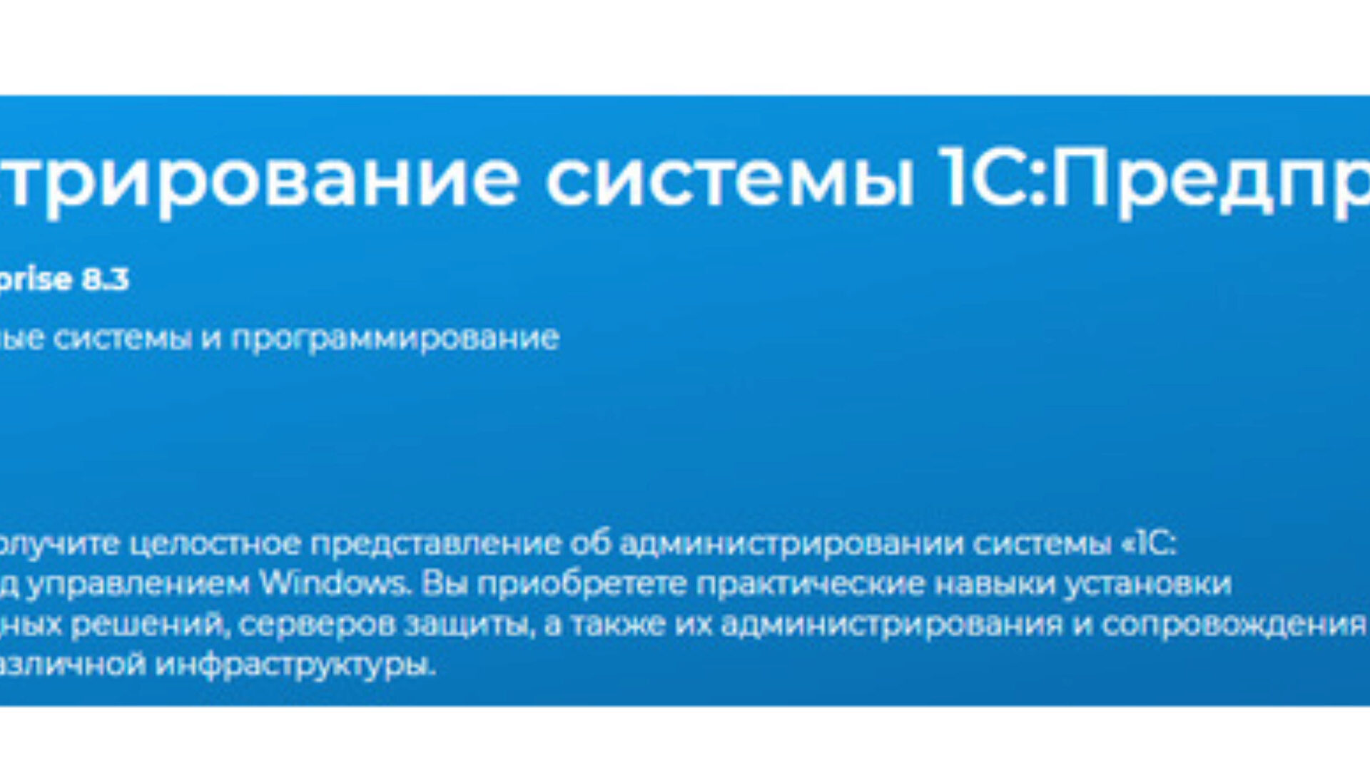 В ходе занятий Вы получите целостное представление об администрировании системы «1С: Предприятие 8.3» под управлением Windows. Вы приобретете практические навыки установки платформы, прикладных решений, серверов защиты, а также их администрирования и сопровождения с использованием различной инфраструктуры.