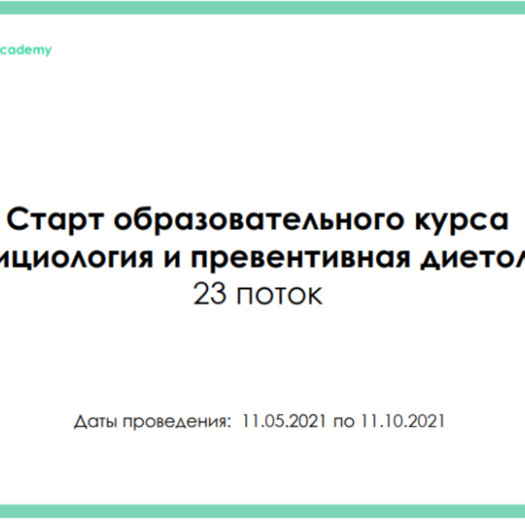 Образовательный курс по нутрициологии и диетологии «22 ПОТОК» Объемно. Фундаментально. Научно. Местами сложно, но захватывающе. Обучение, меняющее взгляд на привычные вещи. Длительность курса: 5 месяцев Академия Нутрициологии лицензирована Министерством образования РФ О курсе: Данная