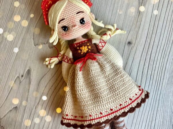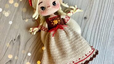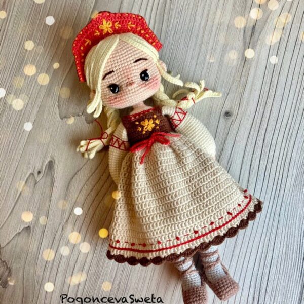 Мастер класс оформлен в PDF Вы получите описание на 21 страницах, включает в себя 28 фото. Высота 14 см. Плечевые и бедерные соединения на пластиковых суставах. Коленные и локтевые соединения шарнирно-нитевые. Голова поворотная. Подробное описание вязания самой малышки, а также сборка куколки.