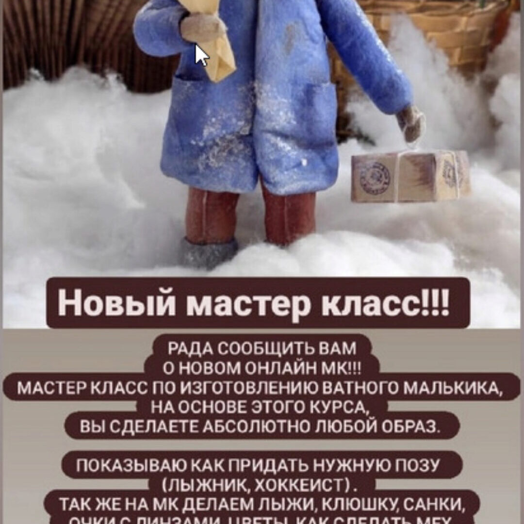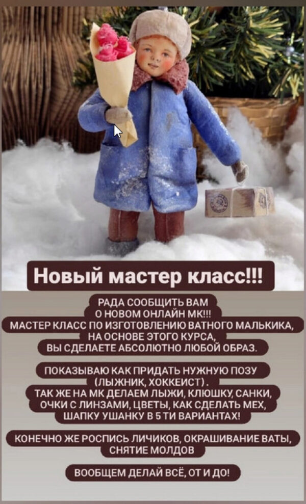 Вниманиепо окончании курса продаж записей не будет. В курсе: 1. Учимся снимать форму с готовой игрушки! 2. Снимаем форму с готовой фигурки! 3. Делаем полноценную ватную игрушку с односторонней формы! Расскажу тонкости ! 4. Доработка деталей 5. Роспись 6.Где брать фигурку для формы расскажу 7.В