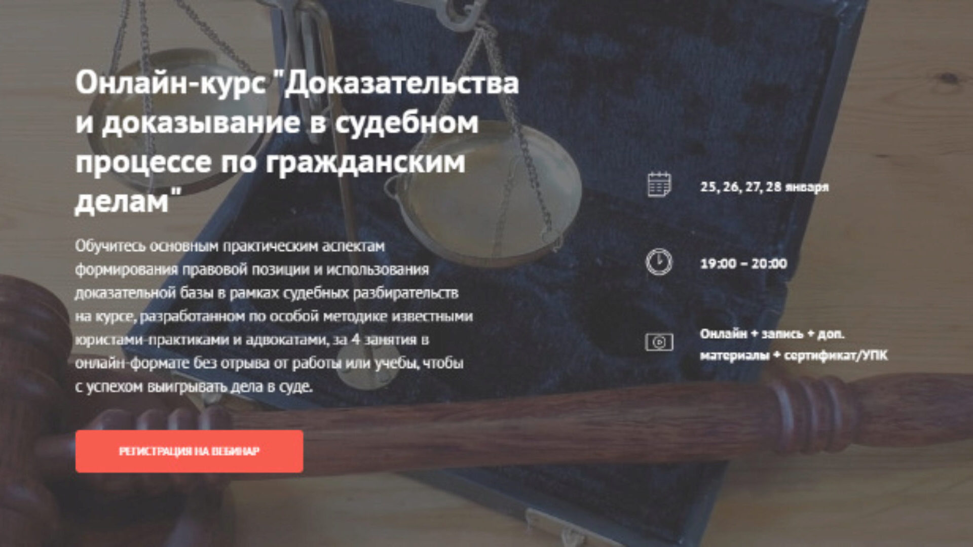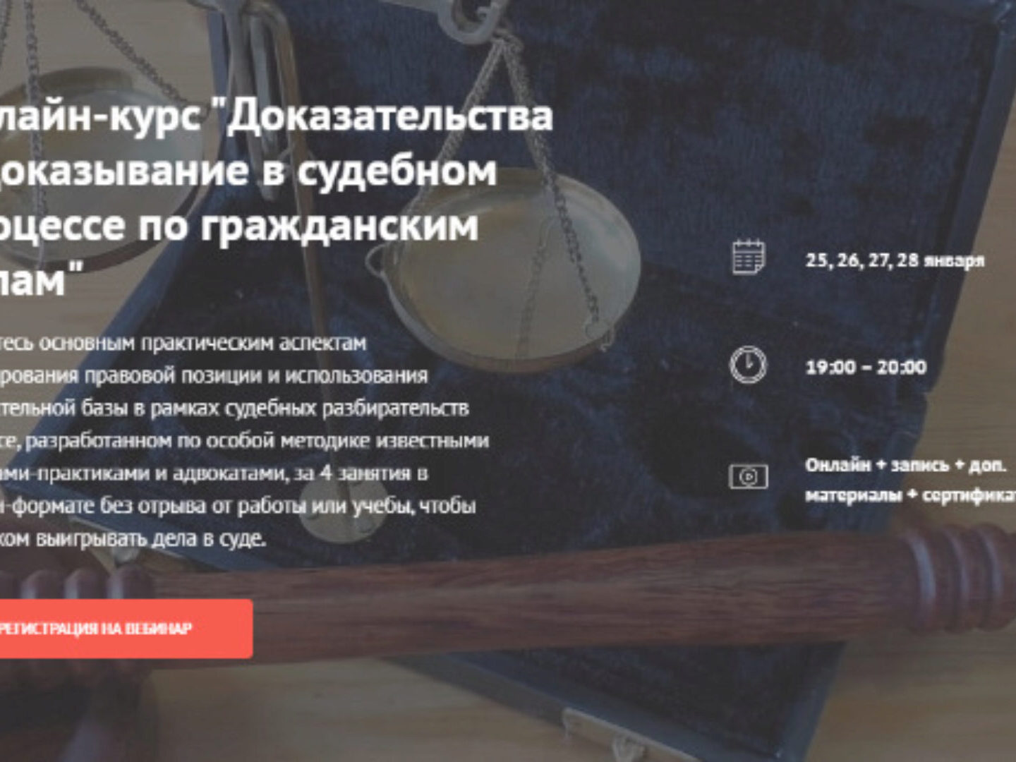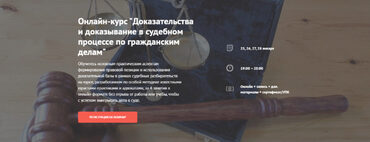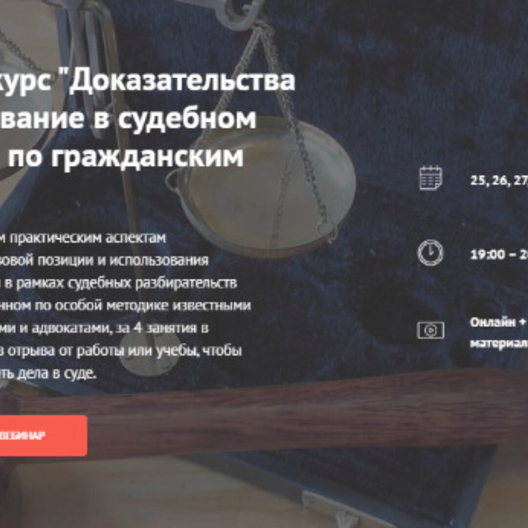 Обучитесь основным практическим аспектам формирования правовой позиции и использования доказательной базы в рамках судебных разбирательств на курсе, разработанном по особой методике известными юристами-практиками и адвокатами, за 4 занятия в онлайн-формате без отрыва от работы или учебы, чтобы с успехом выигрывать дела в суде.