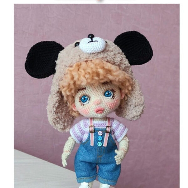 Мастер класс оформлен в PDF . Описание на 21 странице, включает в себя 32 фото. Высота 14 см. Плечевые и бедерные соединения на пластиковых суставах. Коленные и локтевые соединения шарнирно-нитевые. Голова поворотная. Подробное описание вязания самой малышки, а также сборка куколки. Подробное