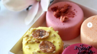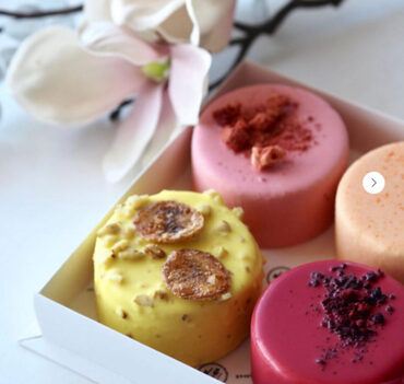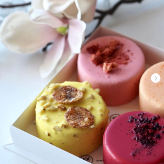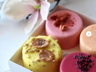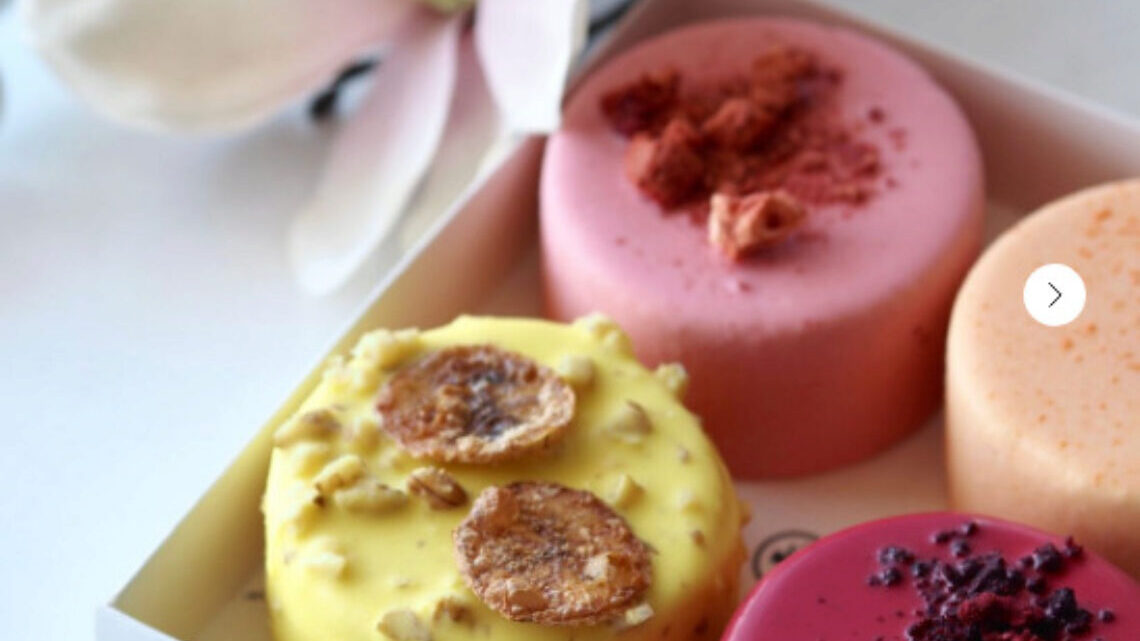 Чизкейки-батончики: «Матча-Черника» в глазури из белого шоколада с добавлением матчи «Мак-Апельсин-Лимон» в глазури из белого шоколада, украшенный пищевым золотом «Клубничный Рафаэлло» в глазури из белого и клубничного шоколада, украшенный кокосовой стружкой «Ваниль-Соленая карамель» в глазури из