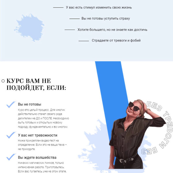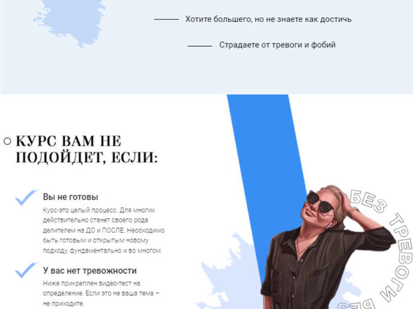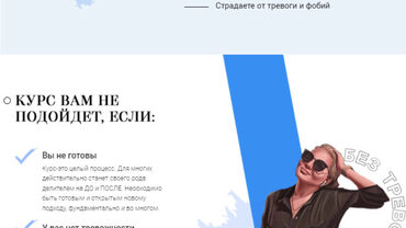 Курс для вас если: У вас есть стимул изменить свою жизнь Вы не готовы уступить страху Страдаете от тревоги и фобий Хотите большего, но не знаете как достичь Курс вам не подойдет, если: Вы не готовы Курс-это целый процесс. Для многих действительно станет своего рода делителем на ДО и ПОСЛЕ.