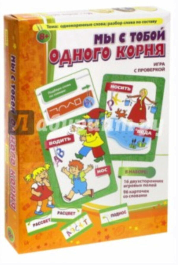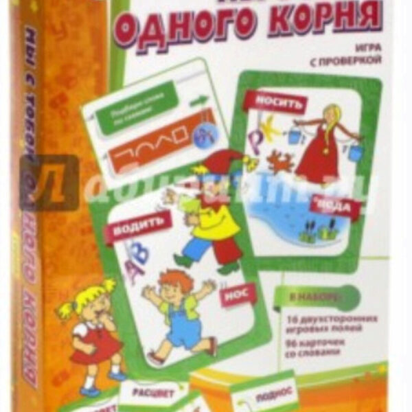 В наборе: 64 маленьких карточки со словами, в которых пропущены безударные гласные в корне слова, 16 больших карточек с проверочными словами. Задача играющего - правильно подобрать проверочное слово к таким, например, похожим парам слов как хвостатый и хвастливый, полоскать и поласкать,