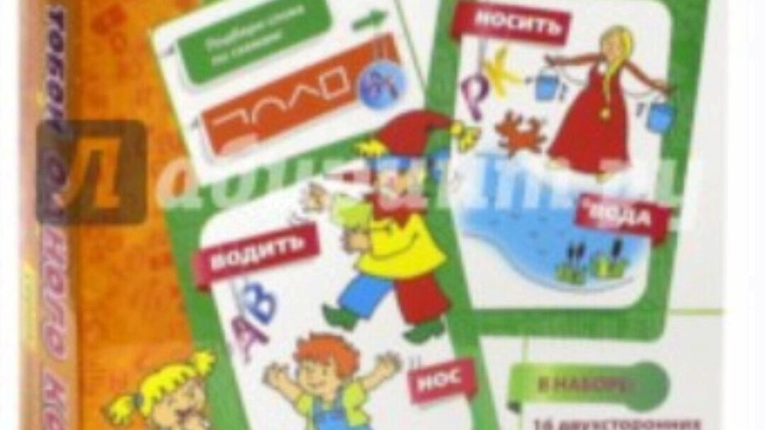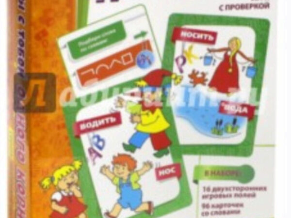 В наборе: 64 маленьких карточки со словами, в которых пропущены гласные (словарные слова), 16 больших карточек с гласными А, О, Е, И. Задача играющего - правильно определить пропущенную букву в слове на маленькой карточке. При правильном выполнении задания из маленьких карточек складывается