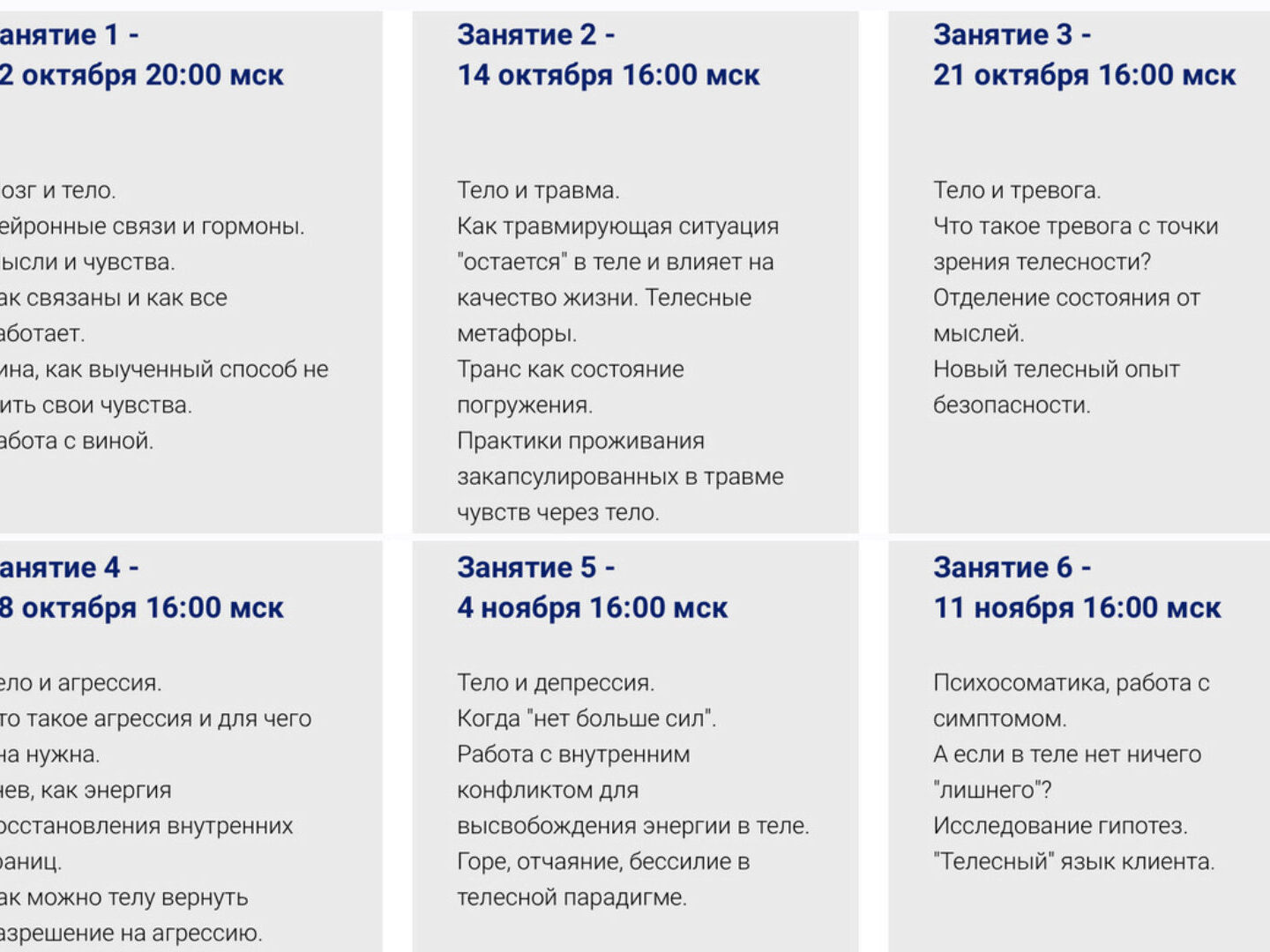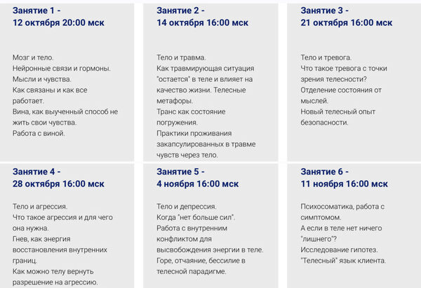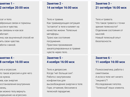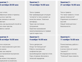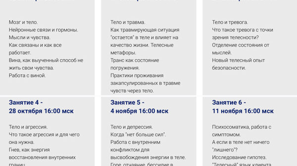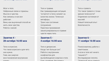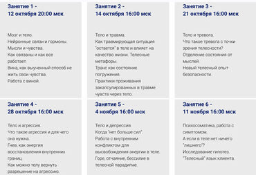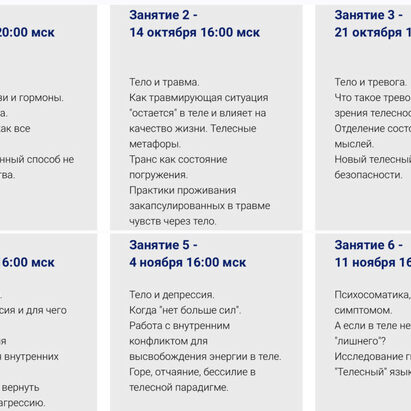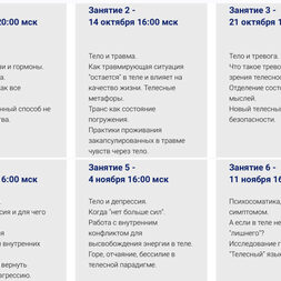 На встречах вас ждет теория и практика работы с переживаниями через тело. В перерывах между встречами - общий чат для обсуждений домашних заданий, своих процессов, наблюдений, инсайтов