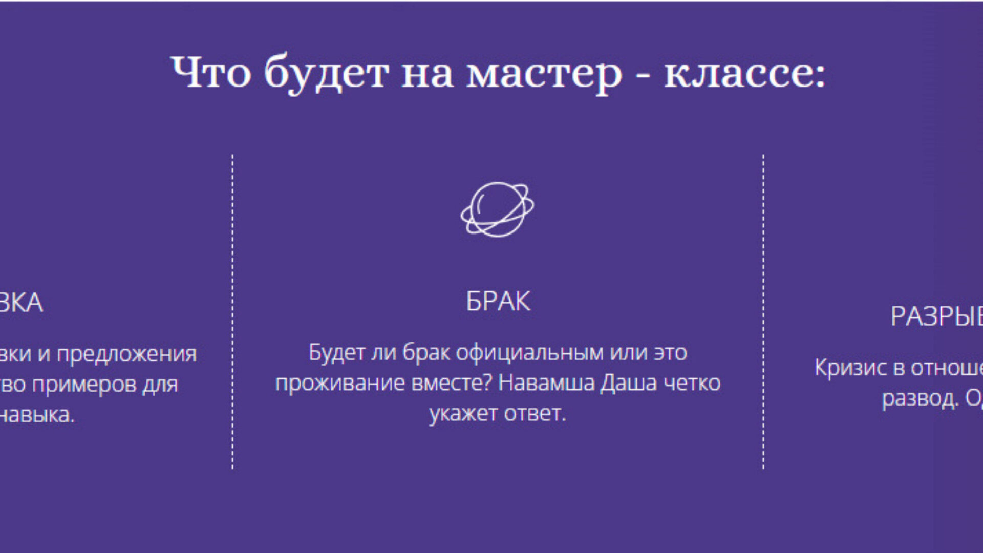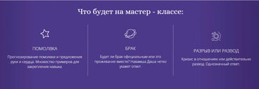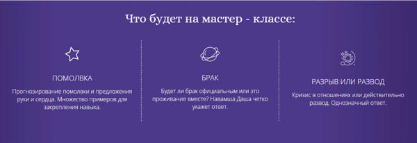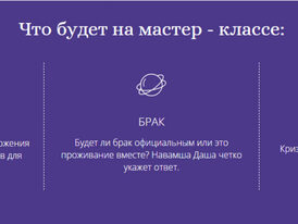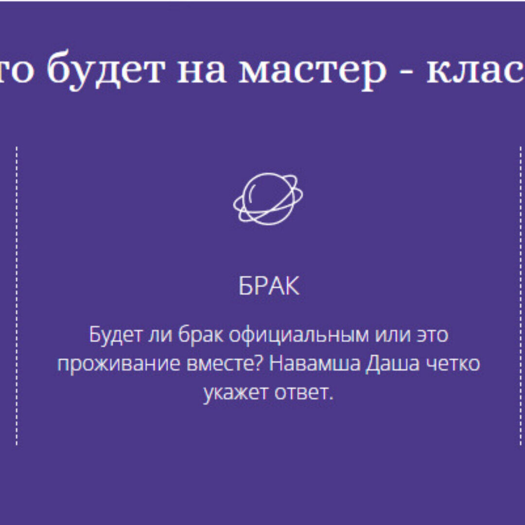 Вы узнаете, как отличить разрыв от официального развода, даже если между ними временной промежуток в несколько лет. Также вы перестанете колебаться при прогнозировании новых отношений и брака, потому что Навамша даст ответ, что именно это будет: тайная любовь, открытые отношения, сожительство, официальный брак. Также я покажу вам, как Навамша показывает саму помолвку и предложение руки и сердца, а как — вступление в брак.