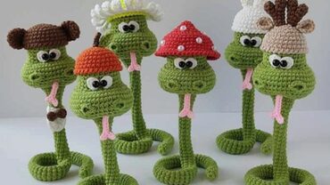В описании входит пошаговое инструкция вязание змеек в двух вариантах: крючок и крючок/спицы. Уровень сложности – лёгкий. Все спицевые детали вяжутся на двух спицах.
