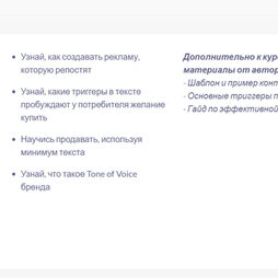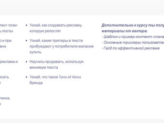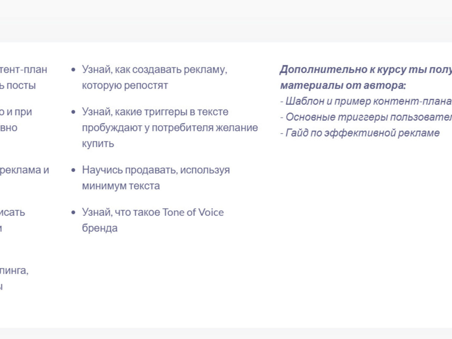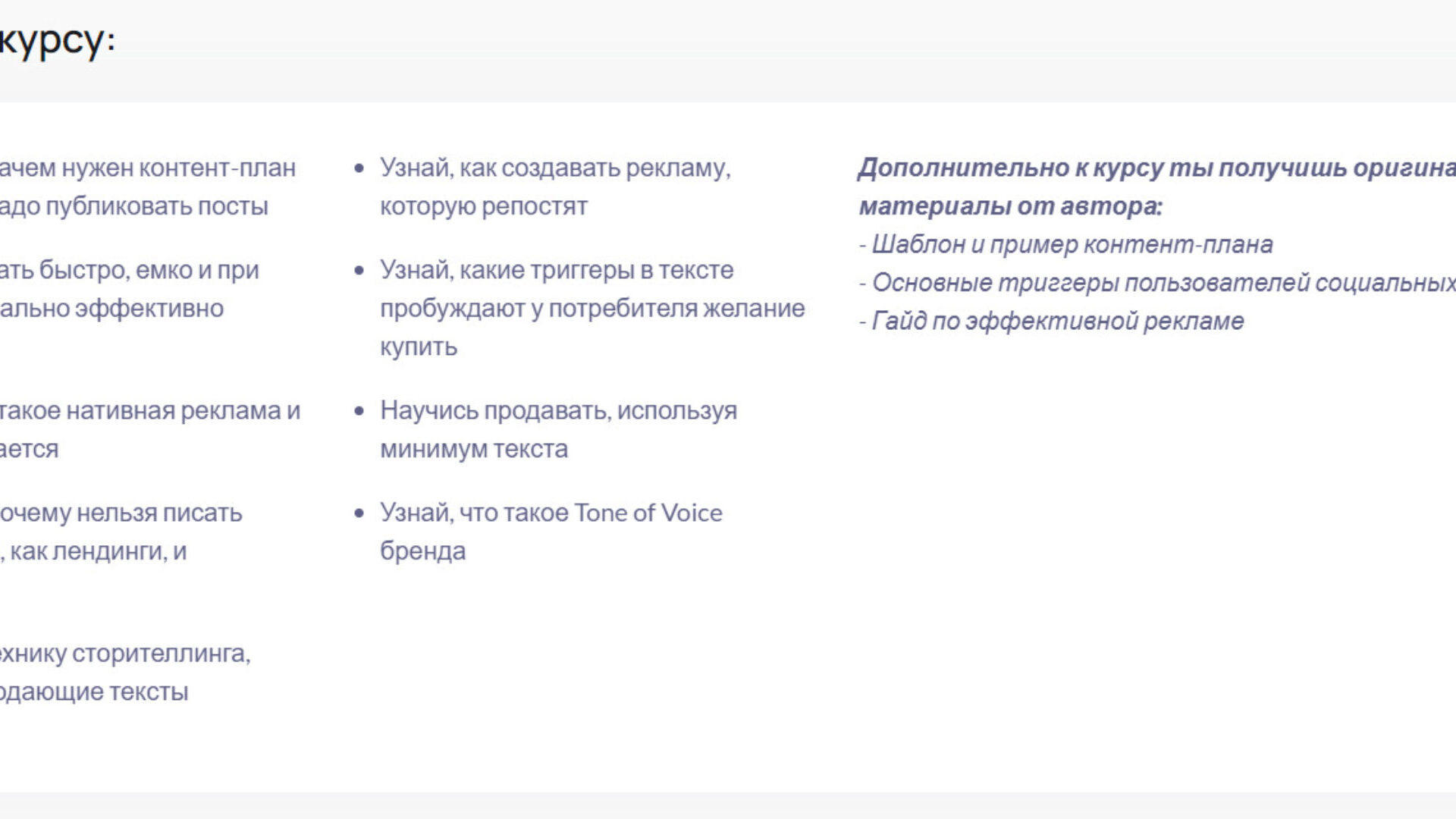 Освой базовые правила и пойми специфику копирайтинга для ВКонтакте Сведи к минимуму проблемы с модерацией ВК Формируй невероятные картинки в головах своих читателей Научись видеть тренды в копирайтинге, которые позволяют оставаться на плаву в любых условиях Освой правила оформления и подачи