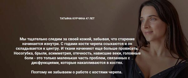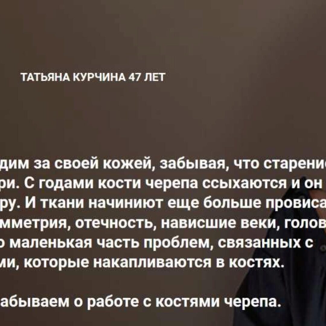 С возрастом в костях и швах копится напряжение, происходит усыхание черепа - он в буквальном смысле складывается к центр и мягкие ткани начинают обвисать. Курс поможет замедлить процесс старения черепа.