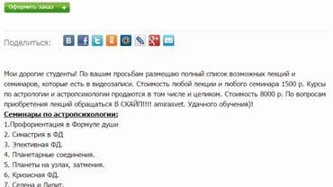 Автор: Татьяна Легасова Мои дорогие студенты! По вашим просьбам размещаю полный список возможных лекций и семинаров, которые есть в видеозаписи. Стоимость любой лекции и любого семинара 1500 р. Курсы по астрологии и астропсихологии продаются в том числе и целиком. Стоимость 8000 р. По вопросам