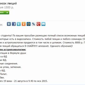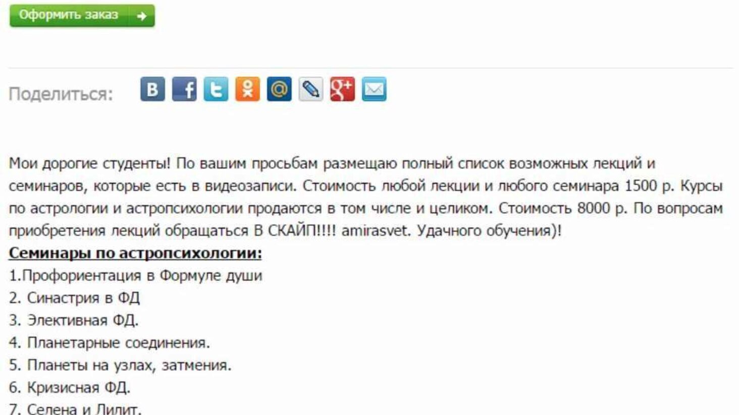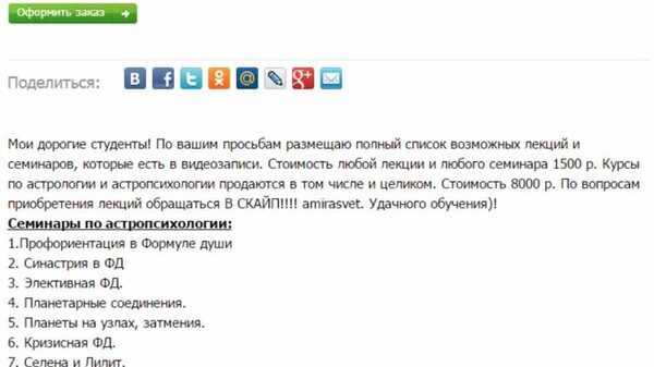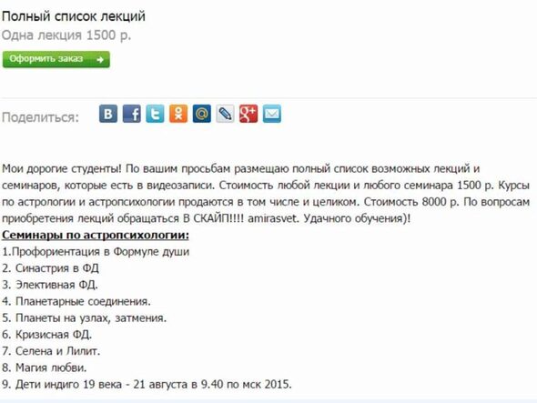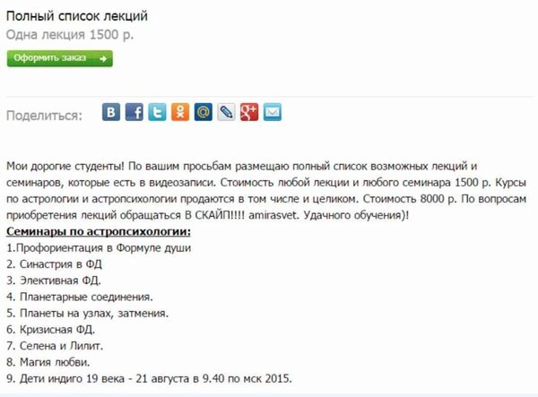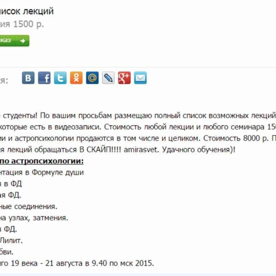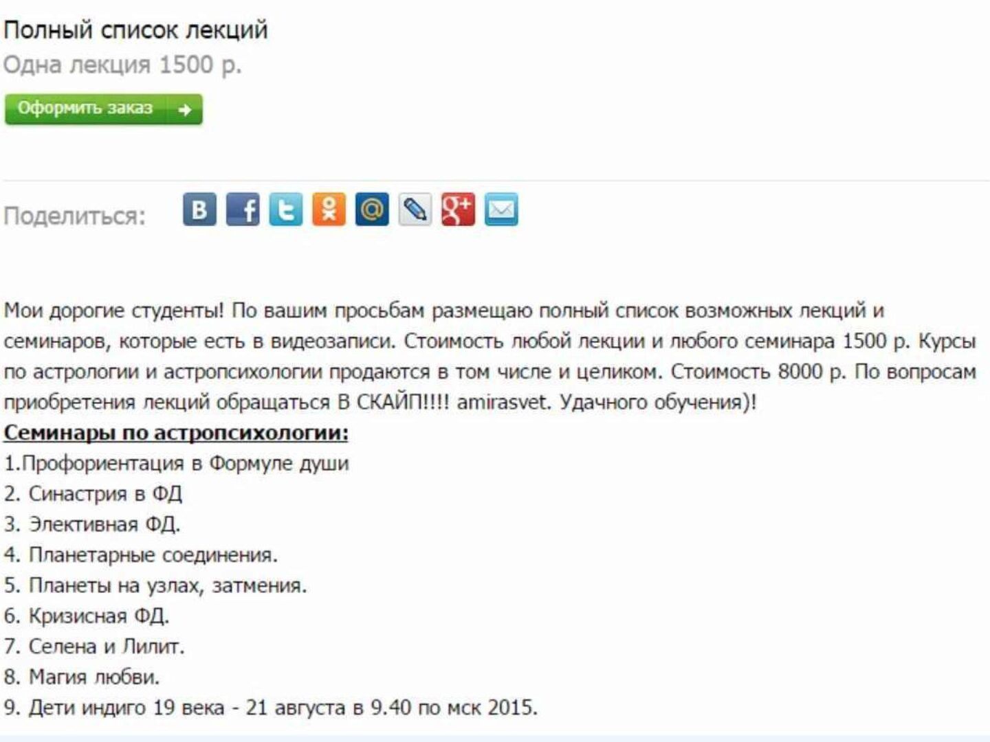 Мои дорогие студенты! По вашим просьбам размещаю полный список возможных лекций и семинаров, которые есть в видеозаписи. Стоимость любой лекции и любого семинара 1500 р. Курсы по астрологии и астропсихологии продаются в том числе и целиком. Стоимость 8000 р. По вопросам приобретения лекций обращаться В СКАЙП!!!! amirasvet. Удачного обучения)!