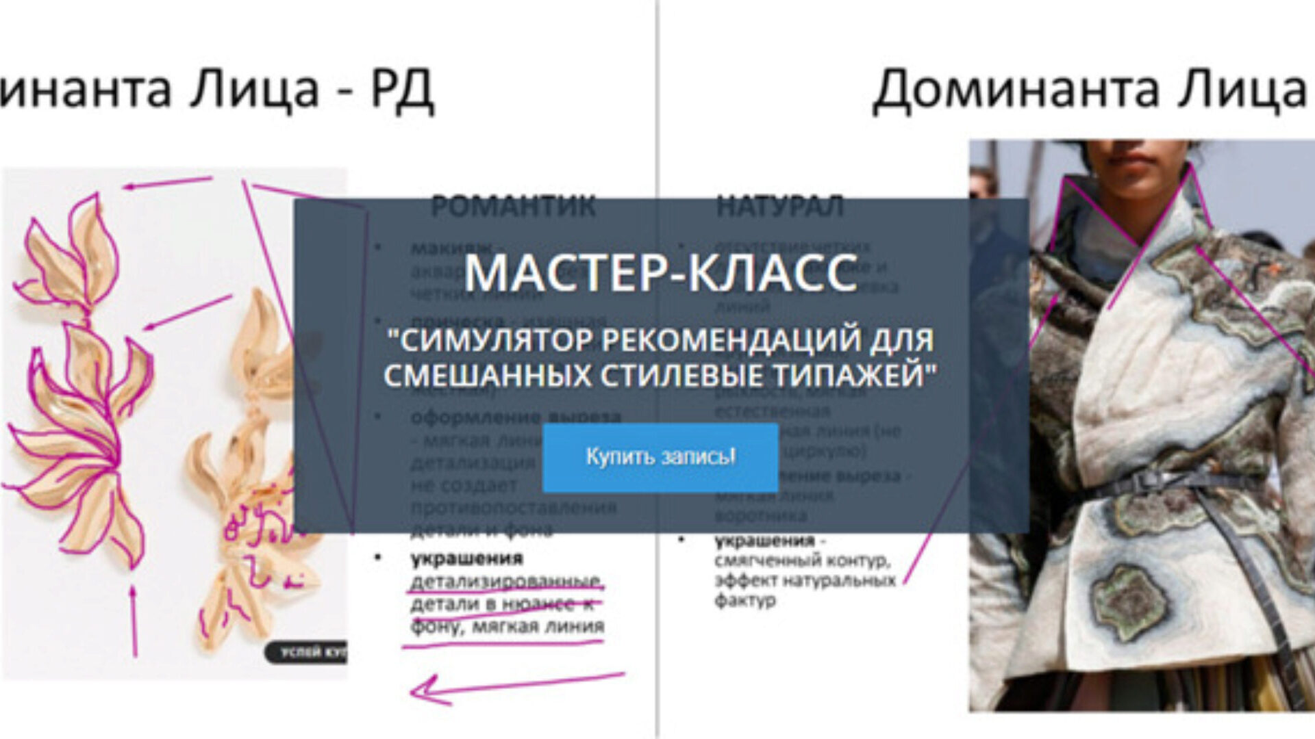 Полный алгоритм создания рекомендации для смешанных стилевые типажей с учётом #ДоминантаЛица и #ДоминантаФигуры — 5 часов теории и практики, разбор примеров и ответы на вопросы! Дополнительно мы коснулись темы стилевого диапазона и адаптации предметов одежды к любой доминанте, что позволяет нам легко трансформировать образ под потребности любой внешности