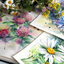 Уроки максимально подробные, начиная от построения карандашом и рецептов смешивания красок для получения прозрачных акварельных переливов и сочных акцентов. Вы нарисуете три акварельных картины, наполненные ощущением тепла летнего луга.