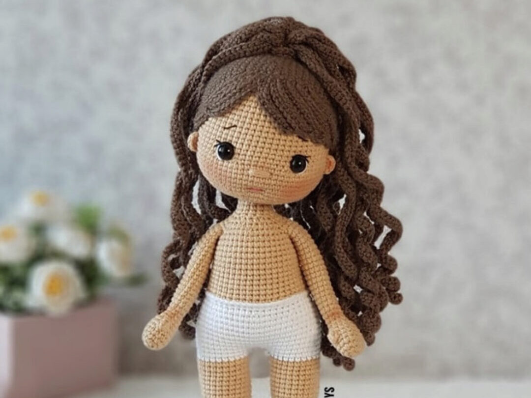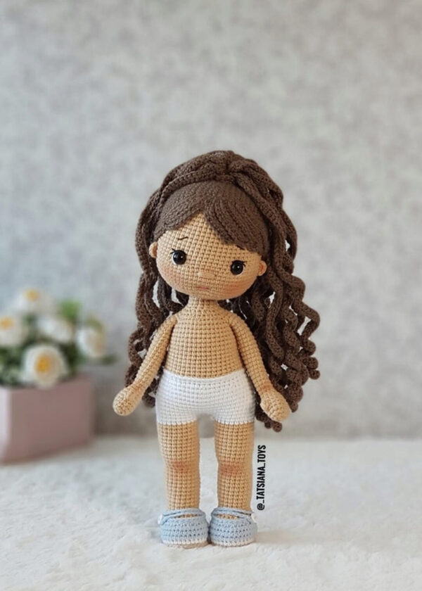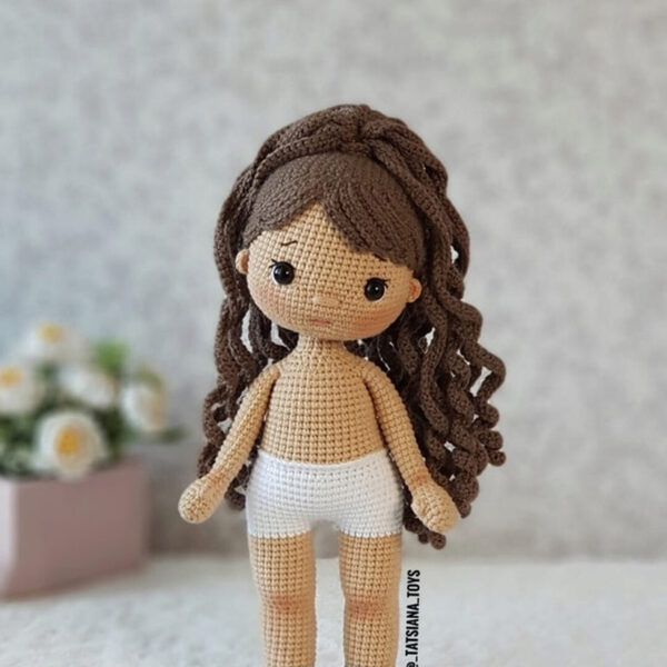 Уровень сложности средний. Для создания куклы необходимо имень основные навыки вязания крючком. Рекомендованные материалы можно посмотреть в карусельке с фото. О кукле: игровая, примерный рост при плотном вязании из рекомендованных материалов 25см, цельновязаная, пришивается только парик, сама не