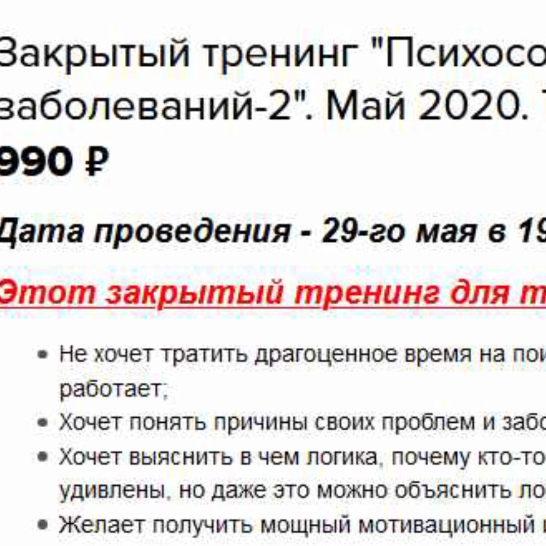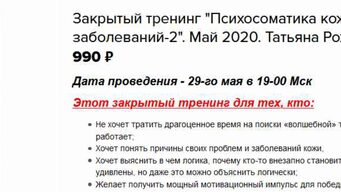 Закрытый тренинг «Психосоматика кожных заболеваний». Май 2020. Татьяна Рожкова. Дата проведения - 15-го мая в 19-00 Мск Этот закрытый тренинг для тех, кто: Не хочет тратить драгоценное время на поиски «волшебной» таблетки, которая, увы, не работает; Хочет понять причины своих проблем и заболеваний