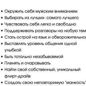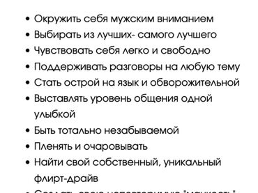 8 уникальных уроков 1. Флирт в крови 2. Социальный флирт 3. Флирт Дресскод 4. Флирт на уровне тела 5. Вербальный флирт 6. Секси флирт 7. Флирт секретный техники 8. Флирт и Мужчины