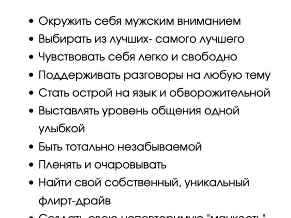 Подходит для интровертов, застенчивых и тех, кто хочет снова влюбить в себя своего мужчину А ещё для тех, кто: У меня давно не было свиданий Я не умею вести себя с мужчинами Я не «легкая» и не умею флиртовать Не могу встретить своего человека Не вижу адыкватных себе мужчин Те, кому я нравлюсь, не