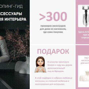 В этом шопинг-гиде я собрала: >300 примеров аксессуаров для дома из магазинов, где я сама покупаю Здесь есть и моя вешалка с рогами, про которую вы постоянно спрашиваете, и пуфик-овечка ПОДАРОК В качестве приятного бонуса к гиду мы дарим дополнительный гид по брендам. В этой подборке я собрала