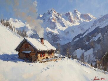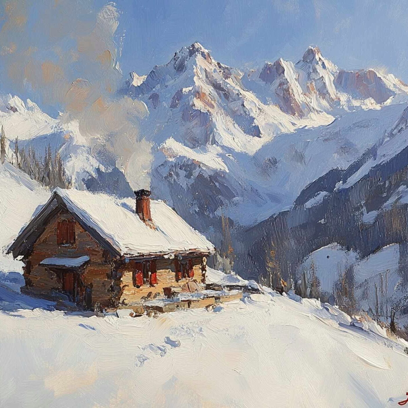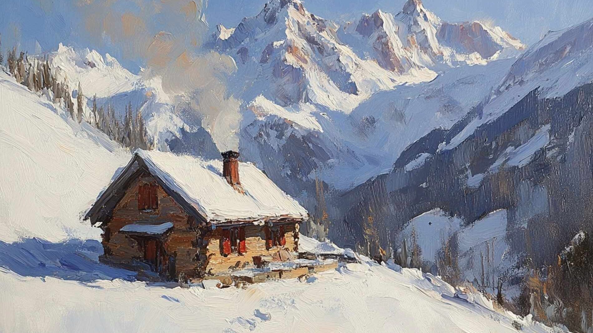 Сегодня мы с вами будем писать уединенный домик, расположенный на горном склоне. Позади виднеются величественные горные вершины, а снег, лежащий вокруг, явно не собирается таять как минимум до самого лета – раздолье для лыжников и пеших туристов, любящих зимние прогулки по горам.