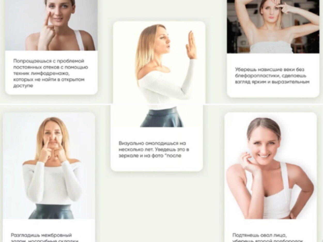 Скрытый текст. Доступен только зарегистрированным пользователям. В этом курсе мы изучим самые эффективные упражнения для восстановления лица: Добьемся эффекта распахнутых глаз Научимся управлять мышцами лба Проработаем щеки Улучшим овал лица Освоим лучший разглаживающий массаж Исправим осанку