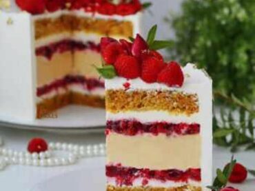 Торт «Фисташка-Малина»: Ванильный бисквит на молоке Молочная пропитка Фисташковый мусс Малиновое конфи Сливочный крем Ганаш на белом шоколаде Технологическая карта в текстовом формате PDF с подробным описанием процессов приготовления.