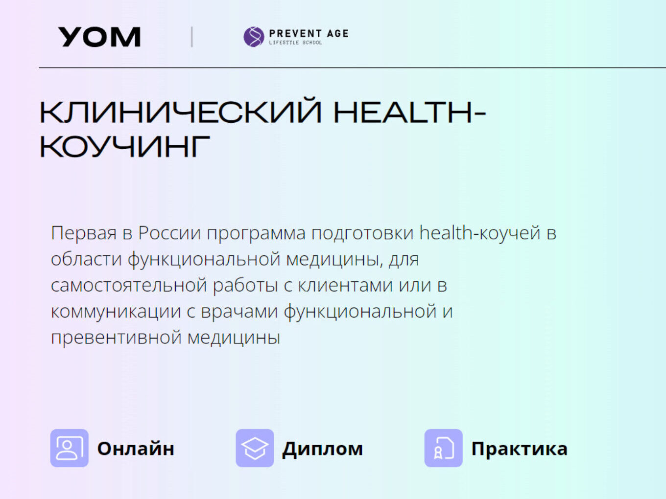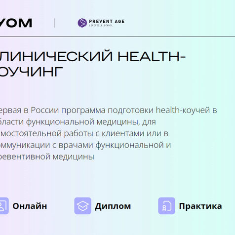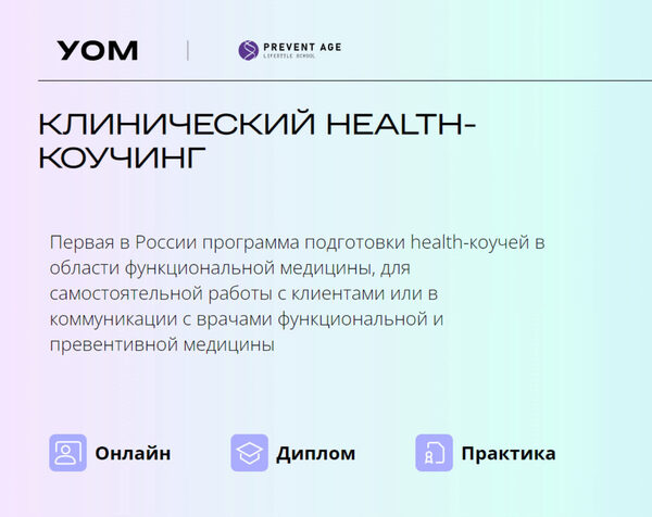 Клинический health-коучинг УОМ | PreventAge Первая в России программа подготовки health-коучей в области функциональной медицины, для самостоятельной работы с клиентами или в коммуникации с врачами функциональной и превентивной медицины Это комплексная экспертная программа подготовки