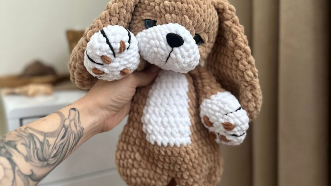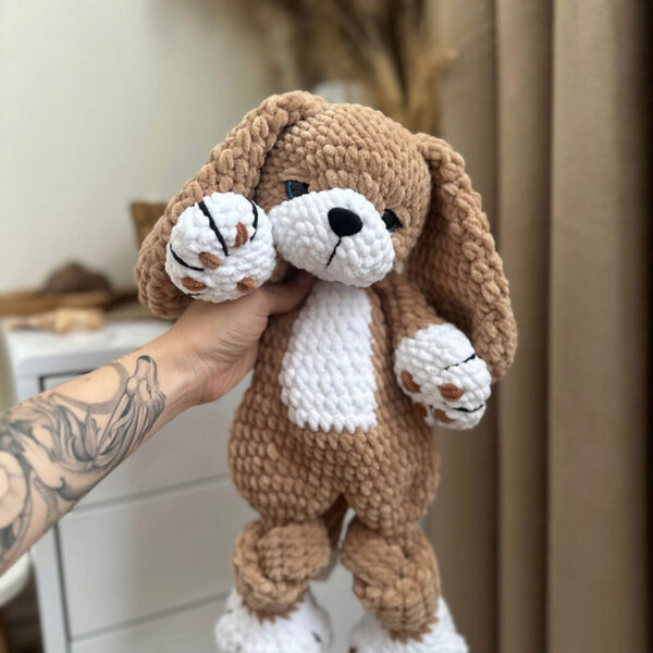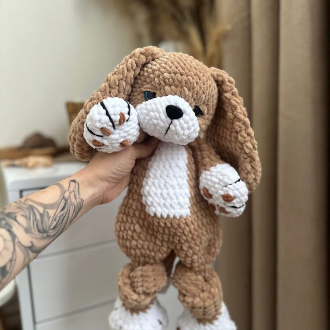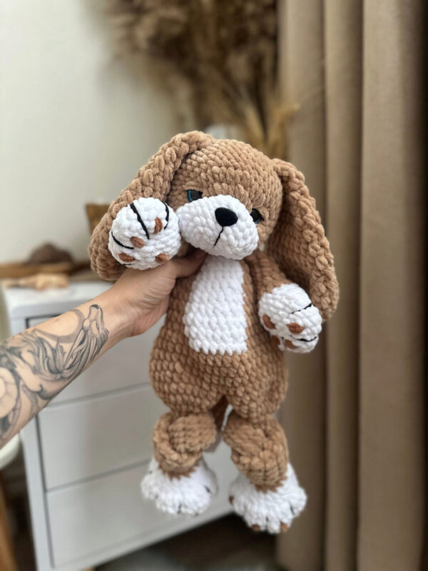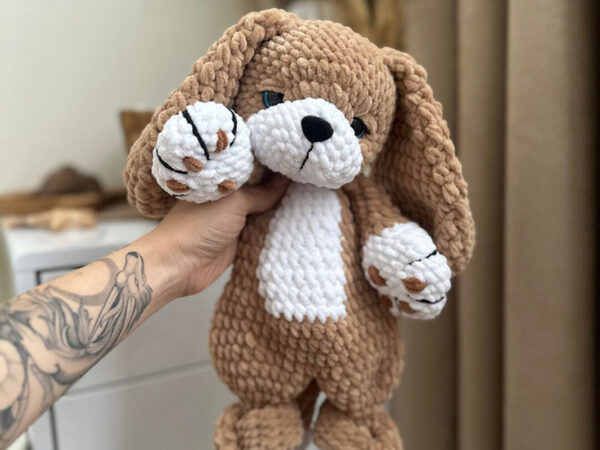 Игрушка высотой ~48 см с завязанными лапками Фотографии этапов вязания Ссылки на видео со сложными моментами, оформлением, утяжкой и сборкой Подробное описание