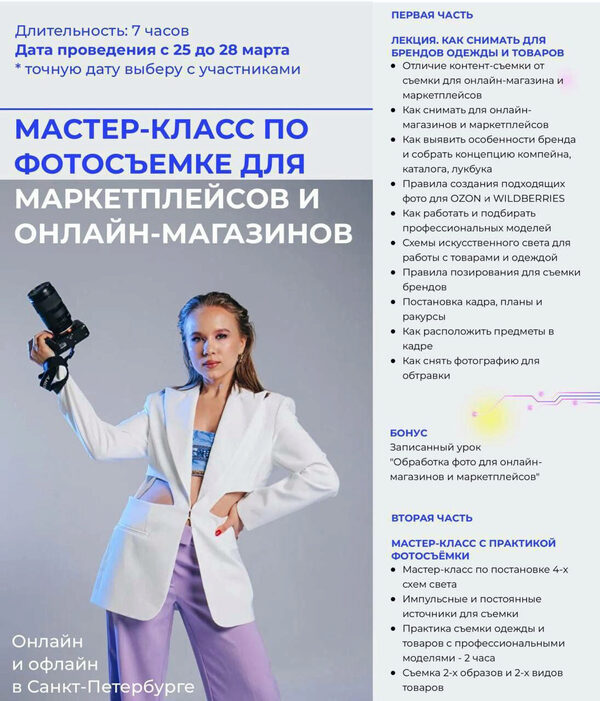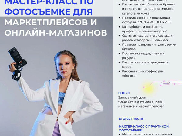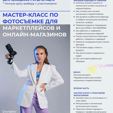 После мастер-класса вы сможете 1. Делать не только красивые, но и продающие съёмки 2. Снизить возвраты из-за некачественных фотографий 3. Повысить процент заказов и выкупа с помощью правильного фотоконтента 4. Избежать ошибок при стилизации съёмок Тезисы мастер-класса Сколько и каких фотографий
