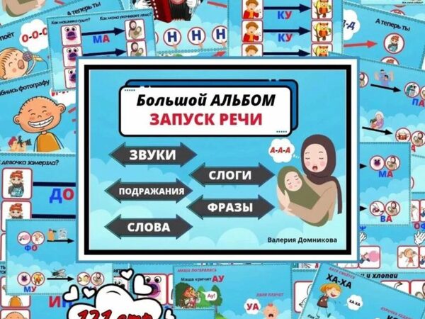 Большая папка «Запуск речи» ЧТО ВХОДИТ 1. Большой Альбом Запуск речи у неговорящих детей: от нуля до фразовой речи. (54 страницы) 2. Большой Альбом «Запуск речи» (121 страница) 3. Альбом «Артикуляция гласных звуков» (25 страниц) 4. Карточки «Запуск речи» первые слова (1 тип ссс) 5. Карточки