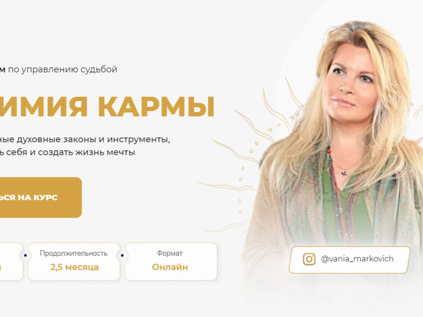 КУРС-ПРАКТИКУМ ПО УПРАВЛЕНИЮ СУДЬБОЙ Узнайте основные духовные законы и инструменты, чтобы изменить свою реальность и приблизиться к настоящему себе Тариф - Таинства жизни 6 модулей основной программы Сессия вопрос-ответ от Вании в начале каждого урока Запись мероприятия 11 декабря 2021 года