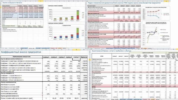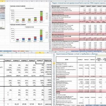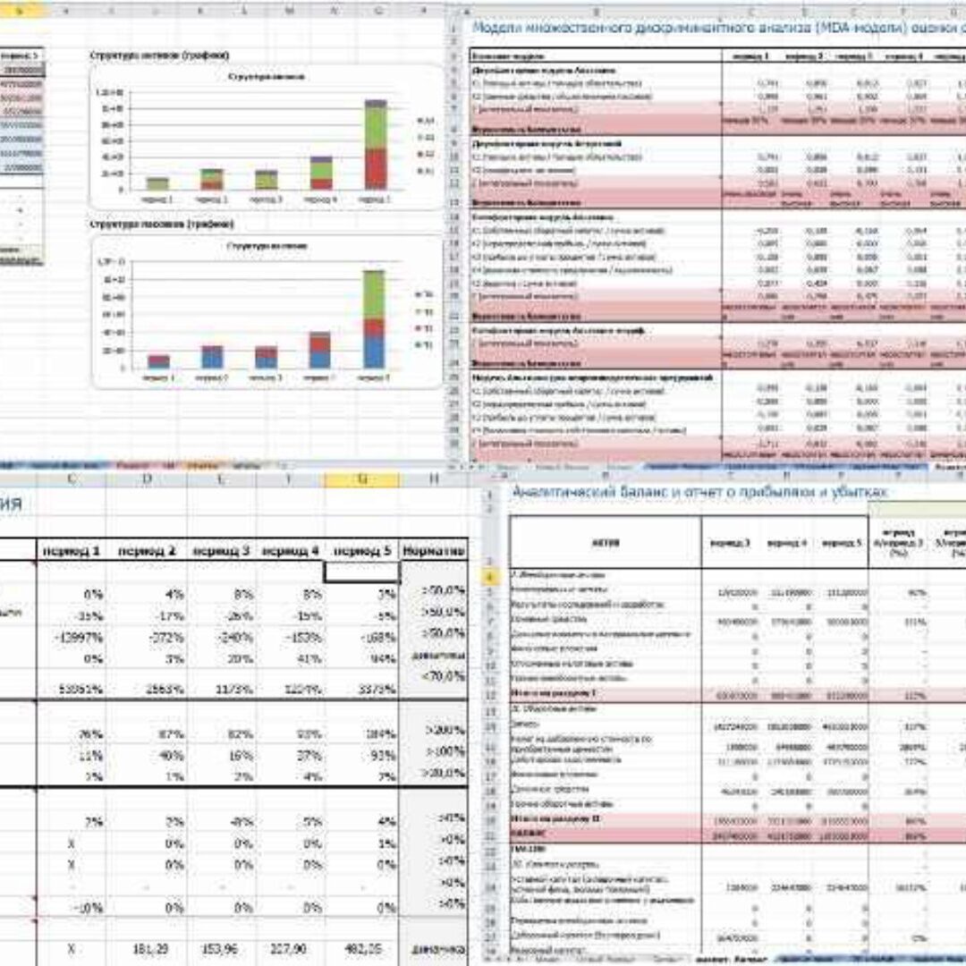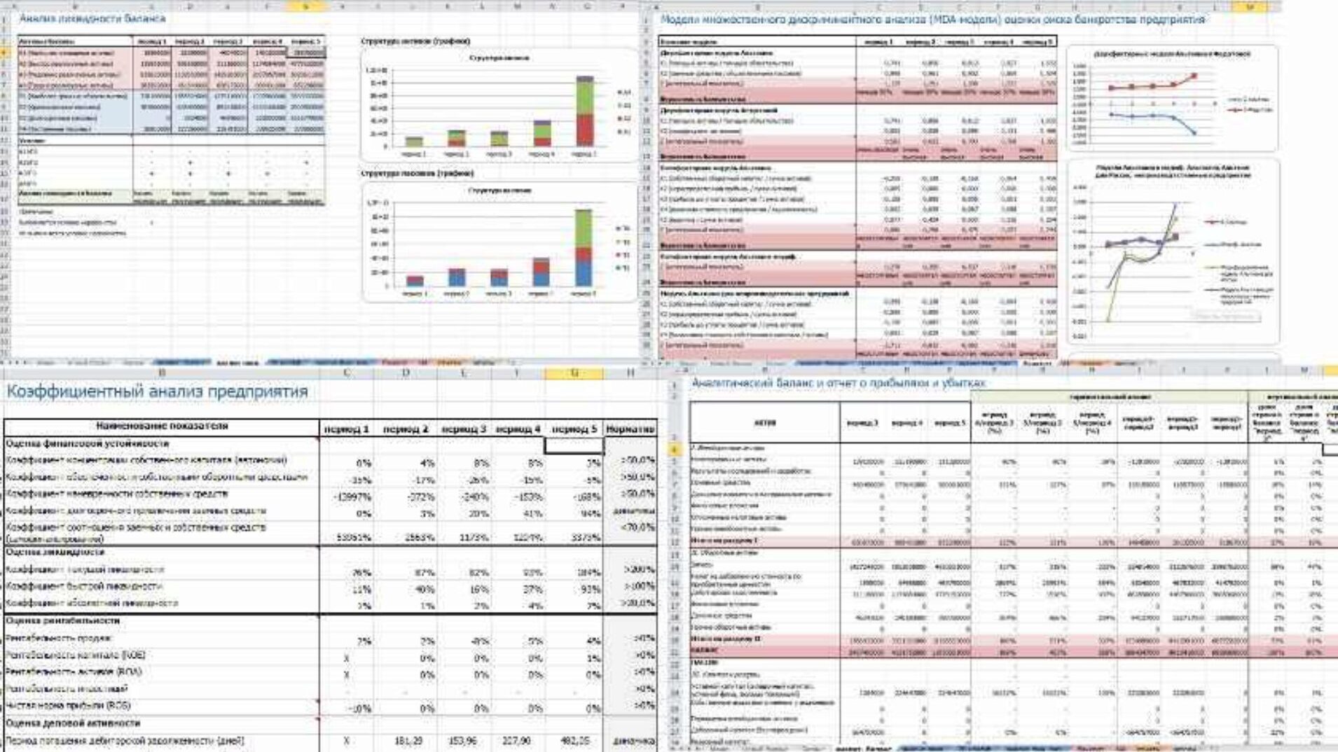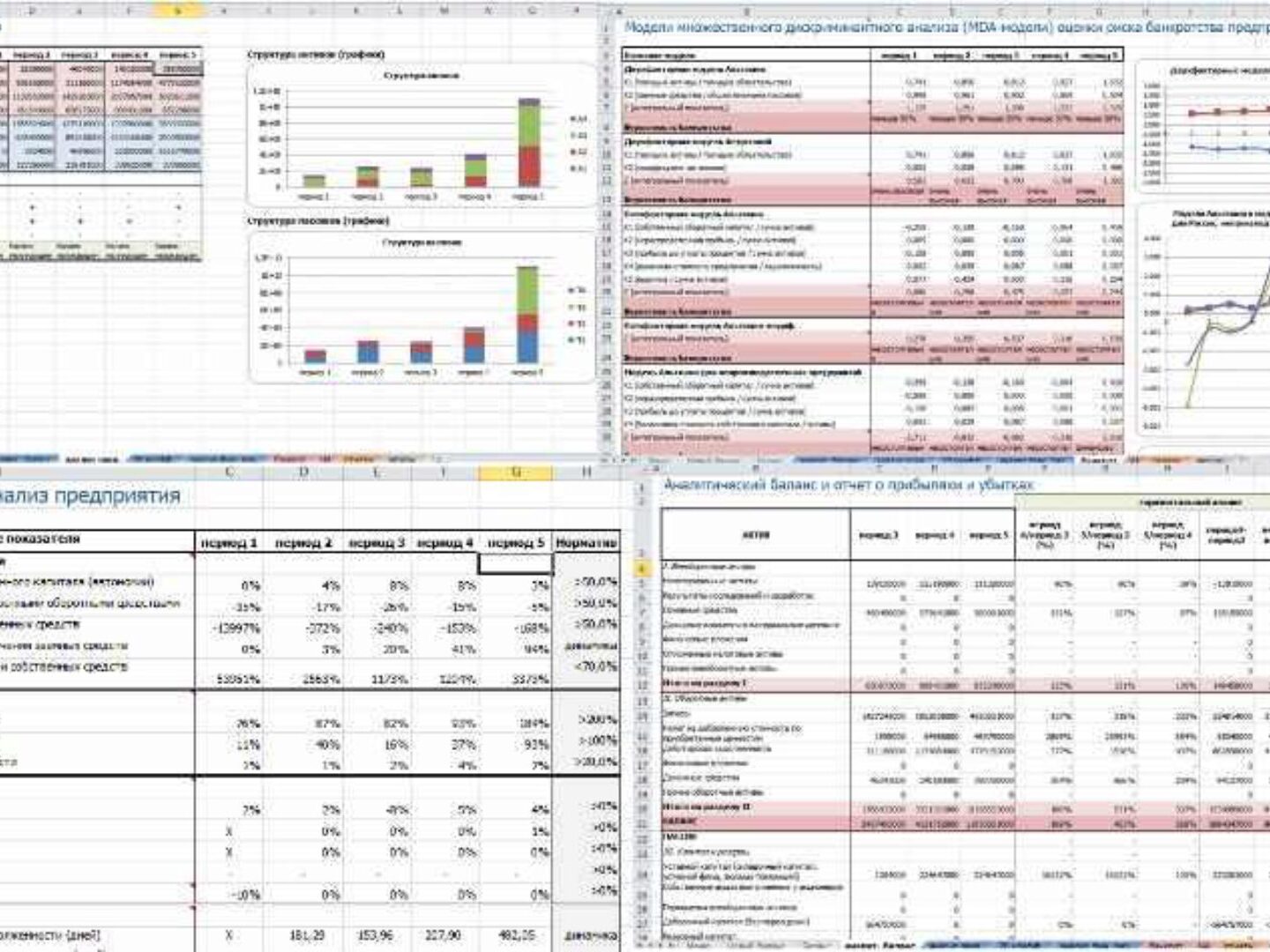 Введя основные данные в таблицы Excel Вы получите самый полный финансовый анализ предприятия. Анализ по основным коэффициентам и моделям риска банкротства и многое другое сведено в единую и понятную программу реализованную в таблицах Excel.
