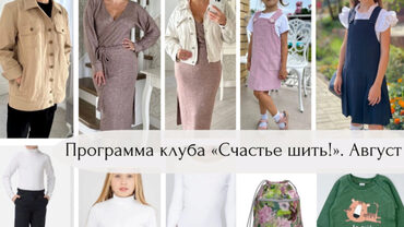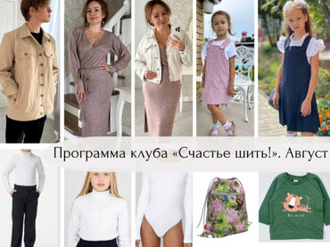 Программа месяца •Пиджак«Брэд» для мужчин и мальчиков •Джинсовая юбка женская «Джулия» •Платье женское «Асель» •Детский костюм «Изабелла» •Женский купальник «Маргарита» •Топ женский трикотажный «Ева» Приглашенные спикеры: •Ева Леман МК «Набор для чаепития» •Архипова Олеса МК «Игольница» •Надежда