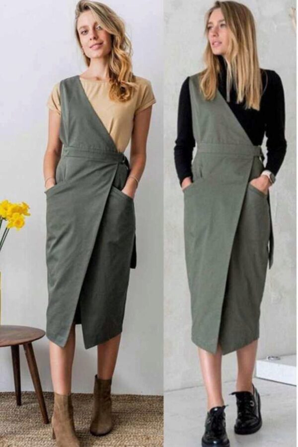 Лиф асимметричного кроя, а юбка имеет запашную двубортную застёжку.