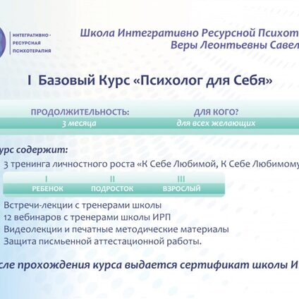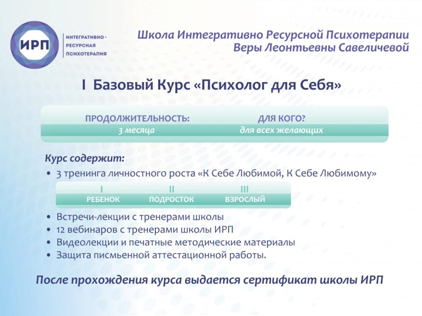 Обучение в школе ИРП – это возможность не только улучшить отношения с собой и окружающими, решить личные актуальные вопросы, но и освоить уникальный по своей эффективности метод, который был создан психотерапевтом с более чем 40-летним опытом работы - Верой Леонтьевной Савеличевой.