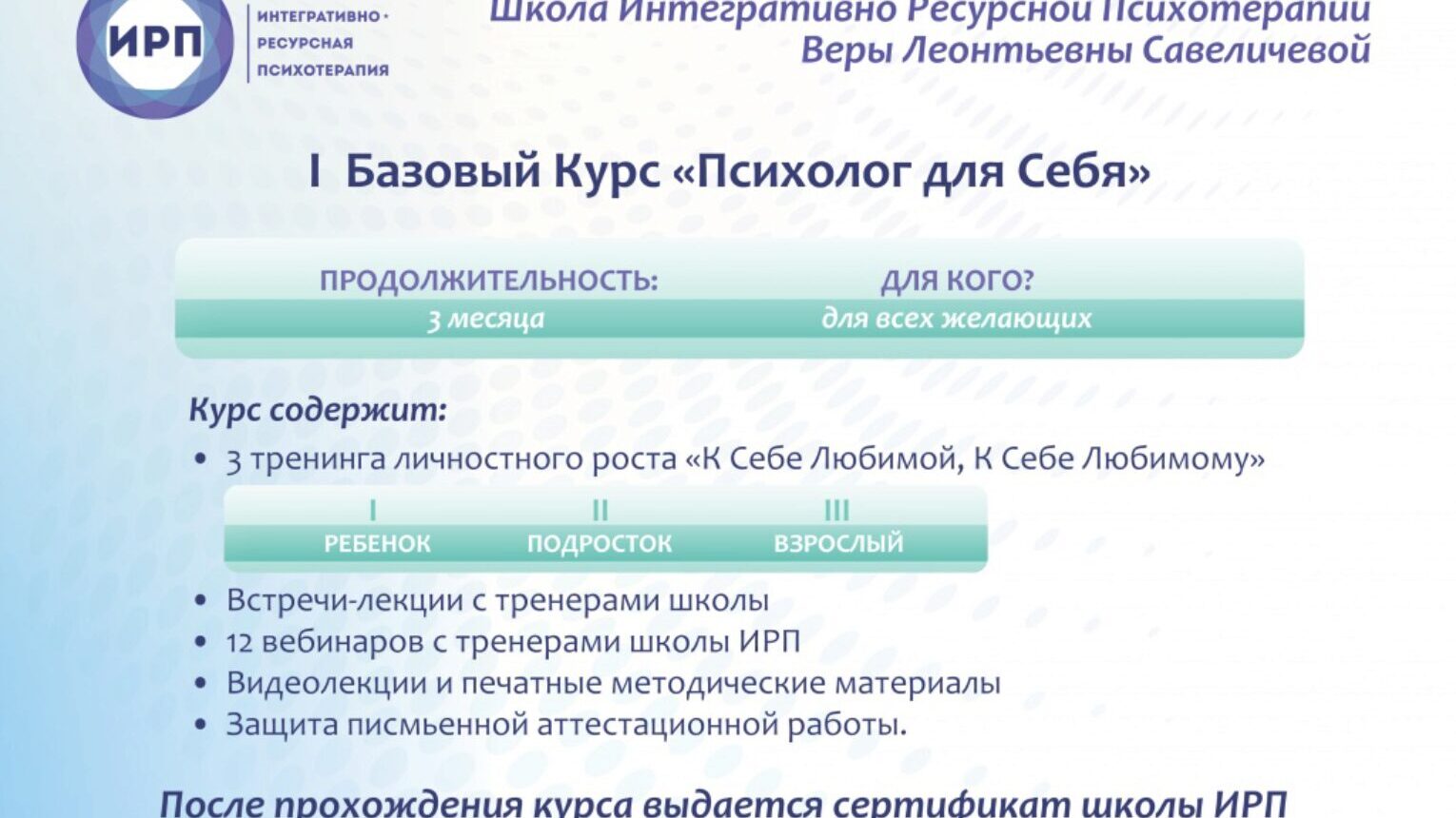 Курс длится 3, 5 месяца и состоит из 3 тренингов личностного роста «К себе любимому, к себе любимой», а также 12 он-лайн лекций по основам теории метода ИРП.