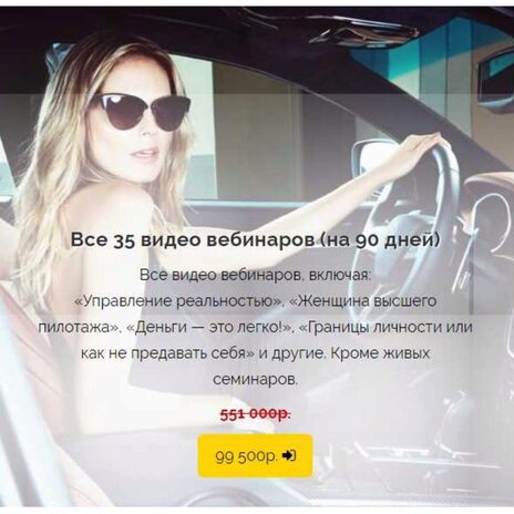 Входят такие вебинары: 1) Искусство общения с мужчиной в период первых свиданий, первого секса и поведения после него 2) Карта желаний. Практика манифеста 3) Границы личности или как не предавать себя 4) Материнский инстинкт или тревога? Идеальная и плохая мать 5) Новая Я 6) Воспитание детей