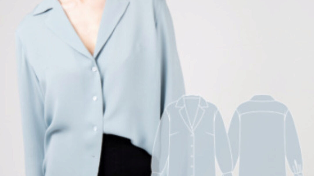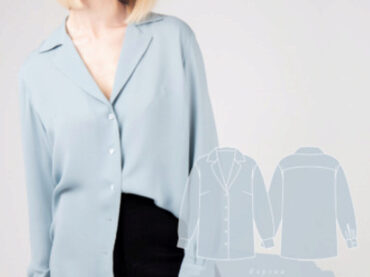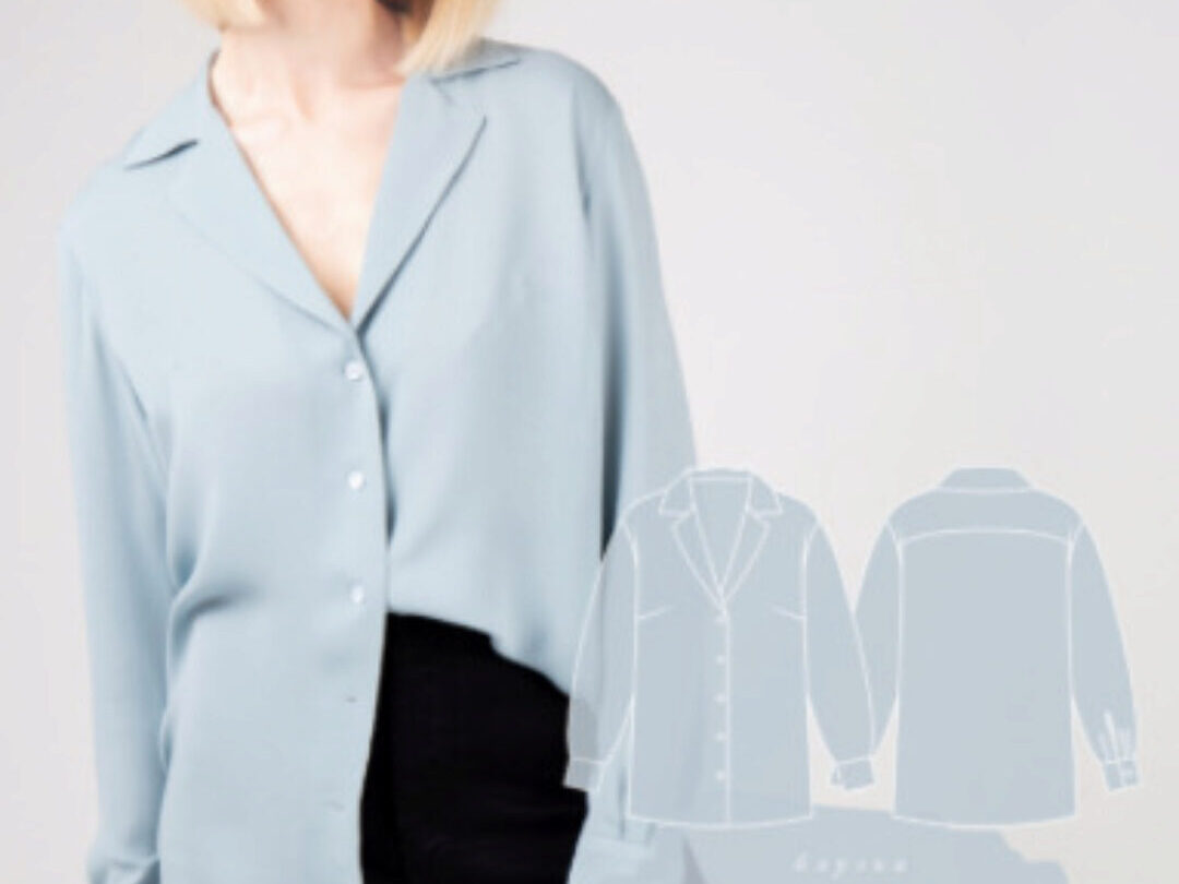 Выкройка блузки большого объема, прямого силуэта. На детали спинки расположена двойная кокетка, переходящая на деталь полочки. Под кокеткой на спинке расположена встречная складка. Воротник рубашечный отложной на стойке. Застежка планка центральная на прорезные петли и пуговицы. Линия плеча